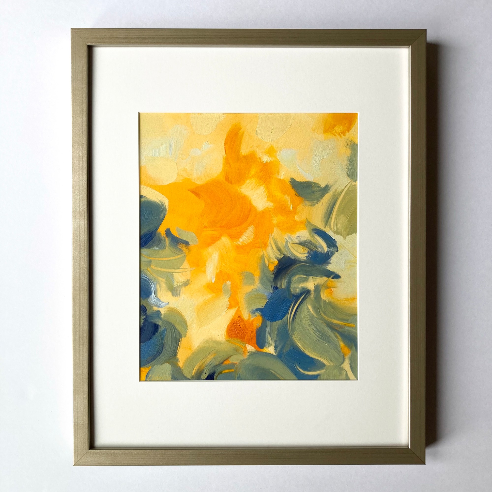 Oil on arches huile paper matted with white cotton rag mat, 20x16 (exterior matted dimensions) framed in warm pewter wood frame.