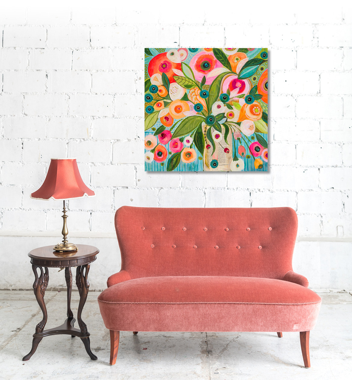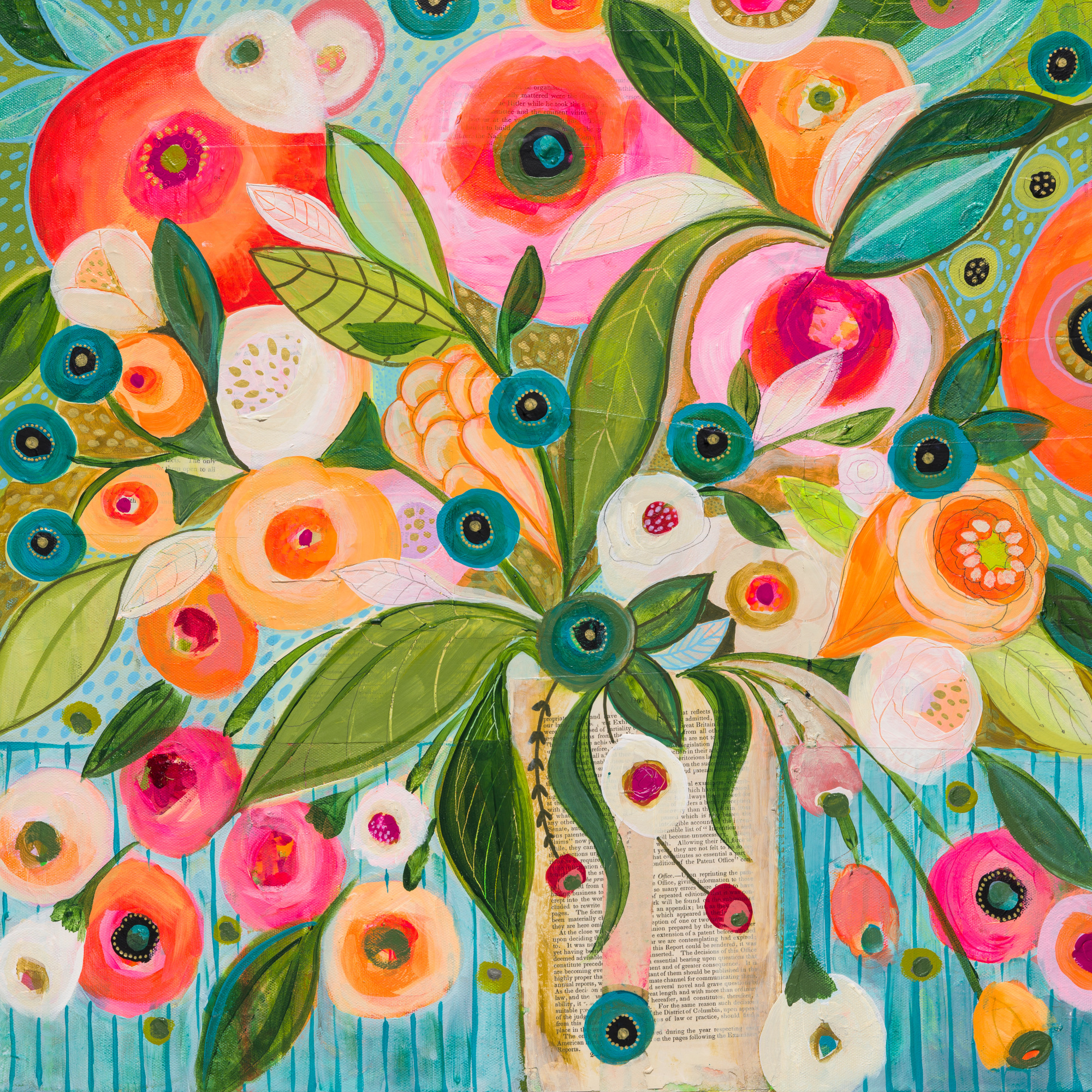 "All Good Here" combines vintage book pages and paint to create a playful, lighthearted floral arrangement. Full of texture and wonder. PAPER AND CANVAS PRINTS AVAILABLE. Message for details.