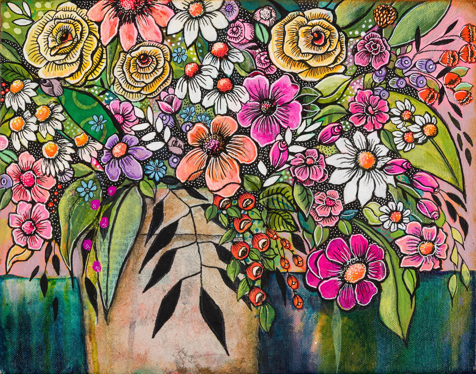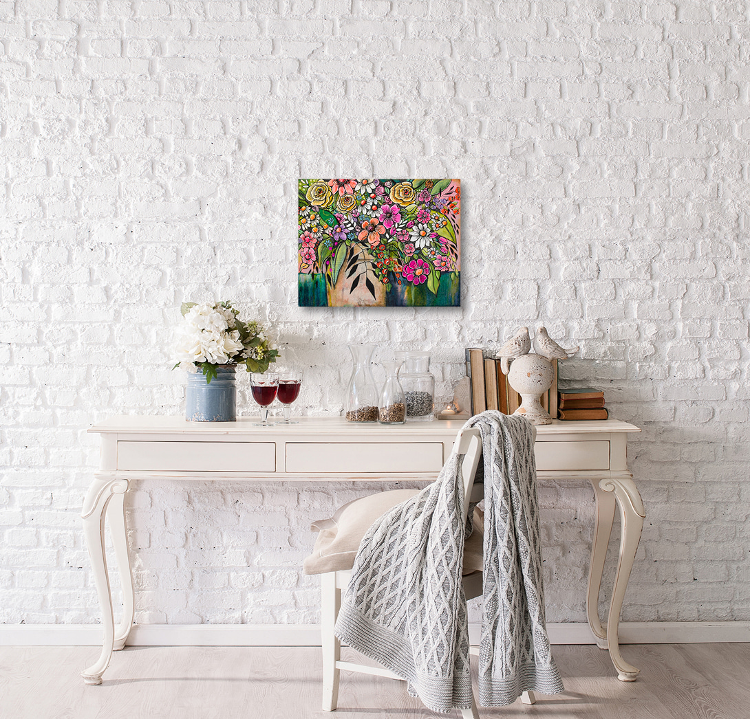 This 12" x 10" original mixed media painting features oodles of texture and color. Perfect for a small space. Ready to hang.