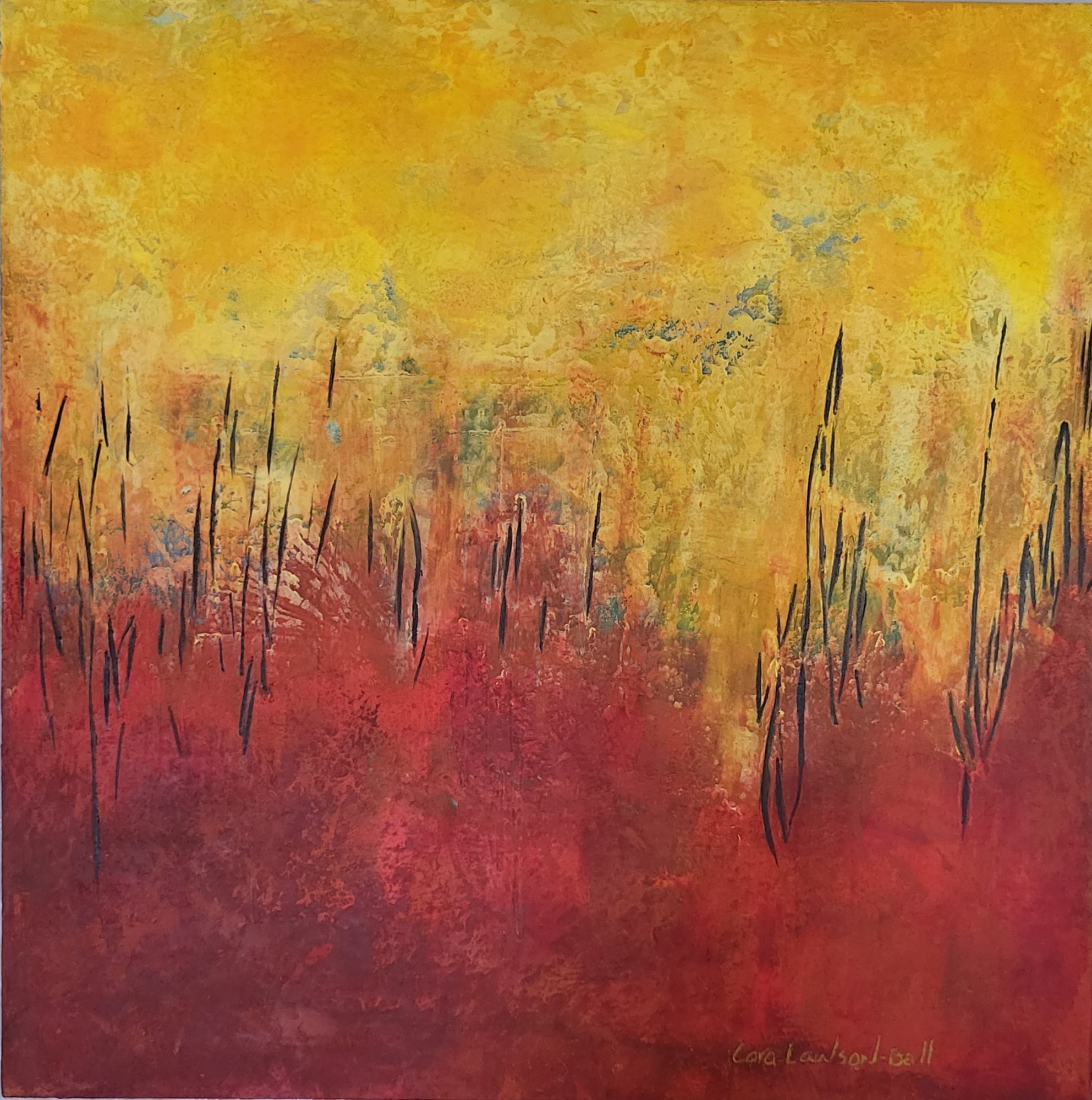 Oil and Cold Wax abstract landscape painting, Before Voices Carry. I am imagining a paper birch woods in the fall, and all is quiet before hiking into all that color.