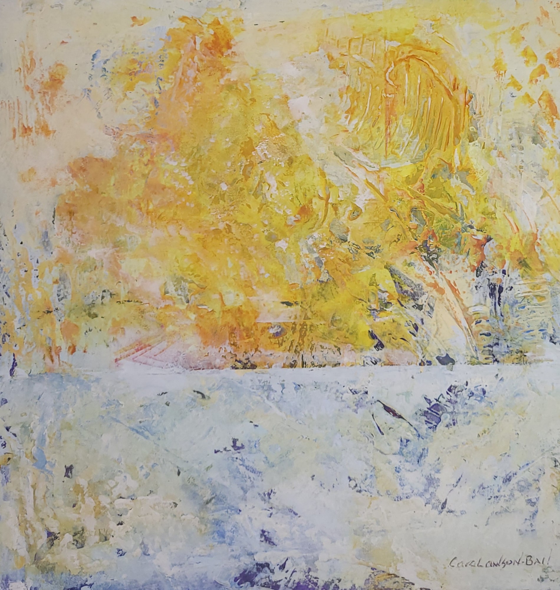 Oil and cold wax abstracted landscape painting on panel in hand made maple frame