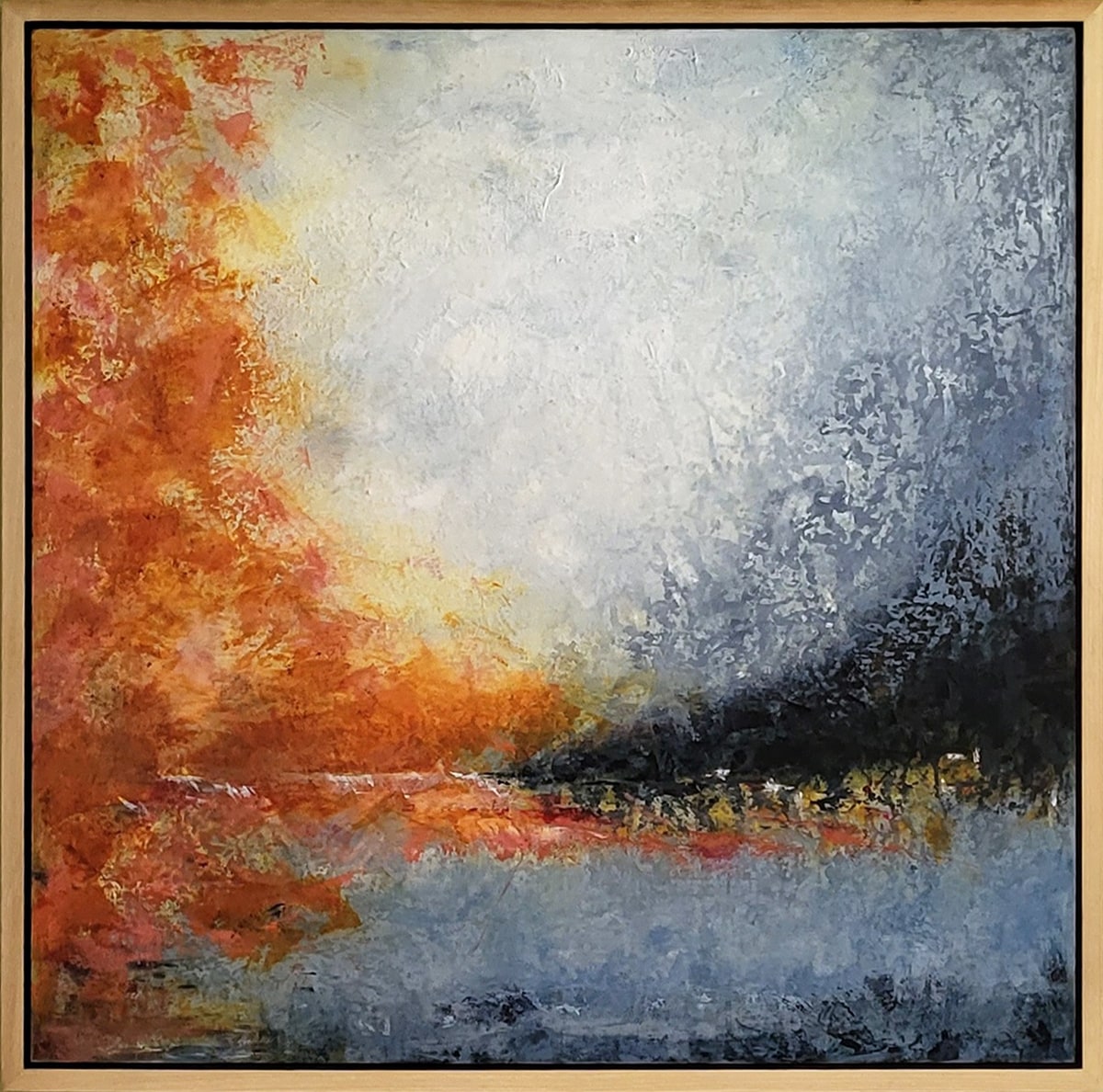 Abstract oil and cold wax landscape on panel, suggesting Spaces Between seasons, friends, strangers, time. Hand made maple frame.