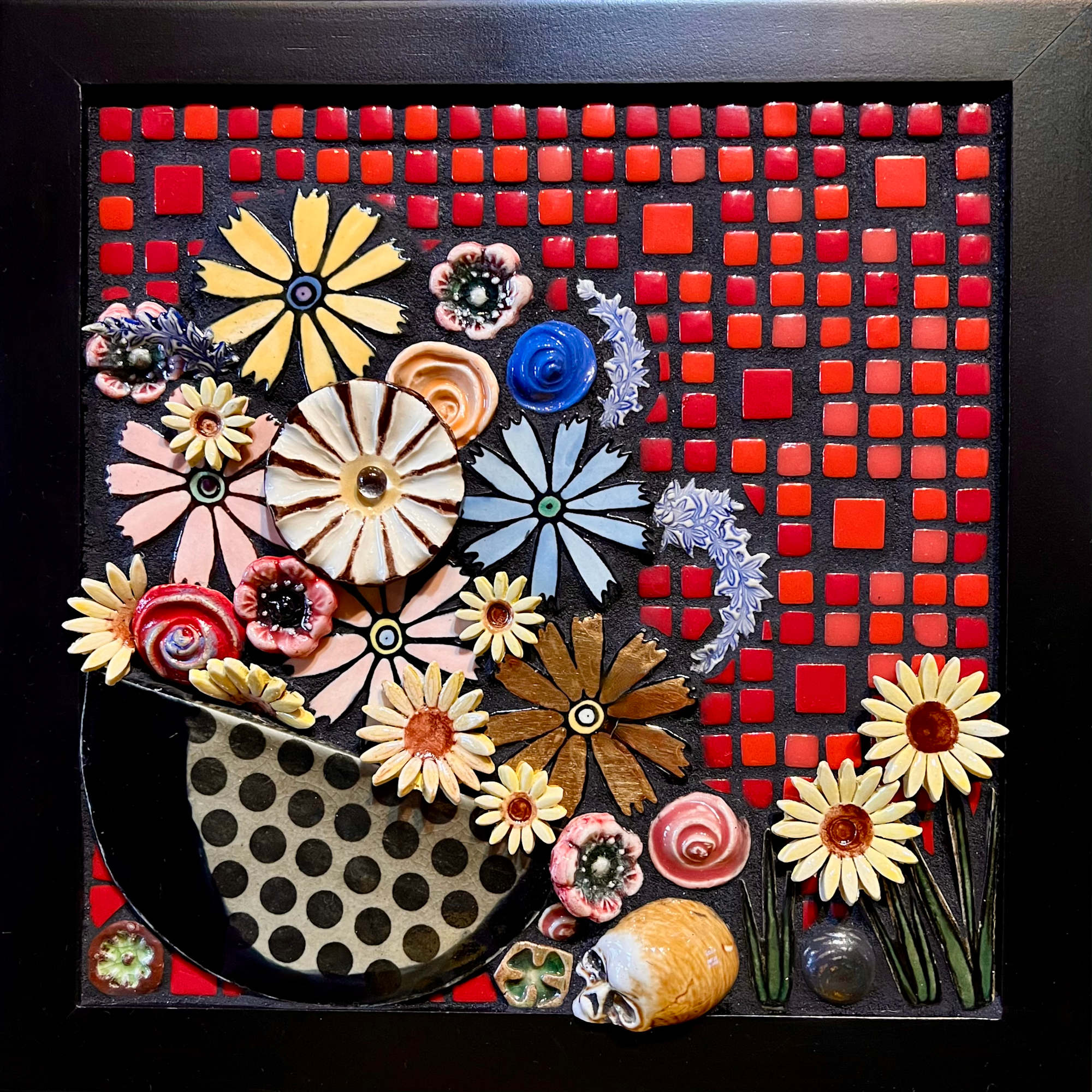 Mosaic still life created with handmade porcelain flowers, found skull and commercial glass tiles.