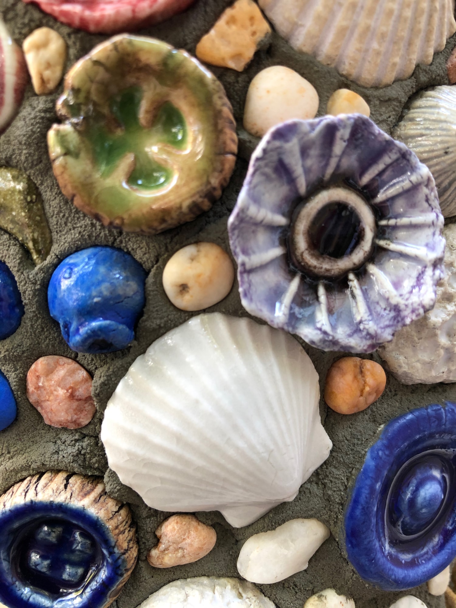 Memory Ware is a traditional form of Folk Art. It usually combines a vessel and a collection of some kind. I started with a vintage ceramic jug and covered it with test tiles, "leftovers" from other pieces, and tiles I made just for fun. They are snapshots of my studio life and are a record of the glazes, clay bodies, and images that have interested me.