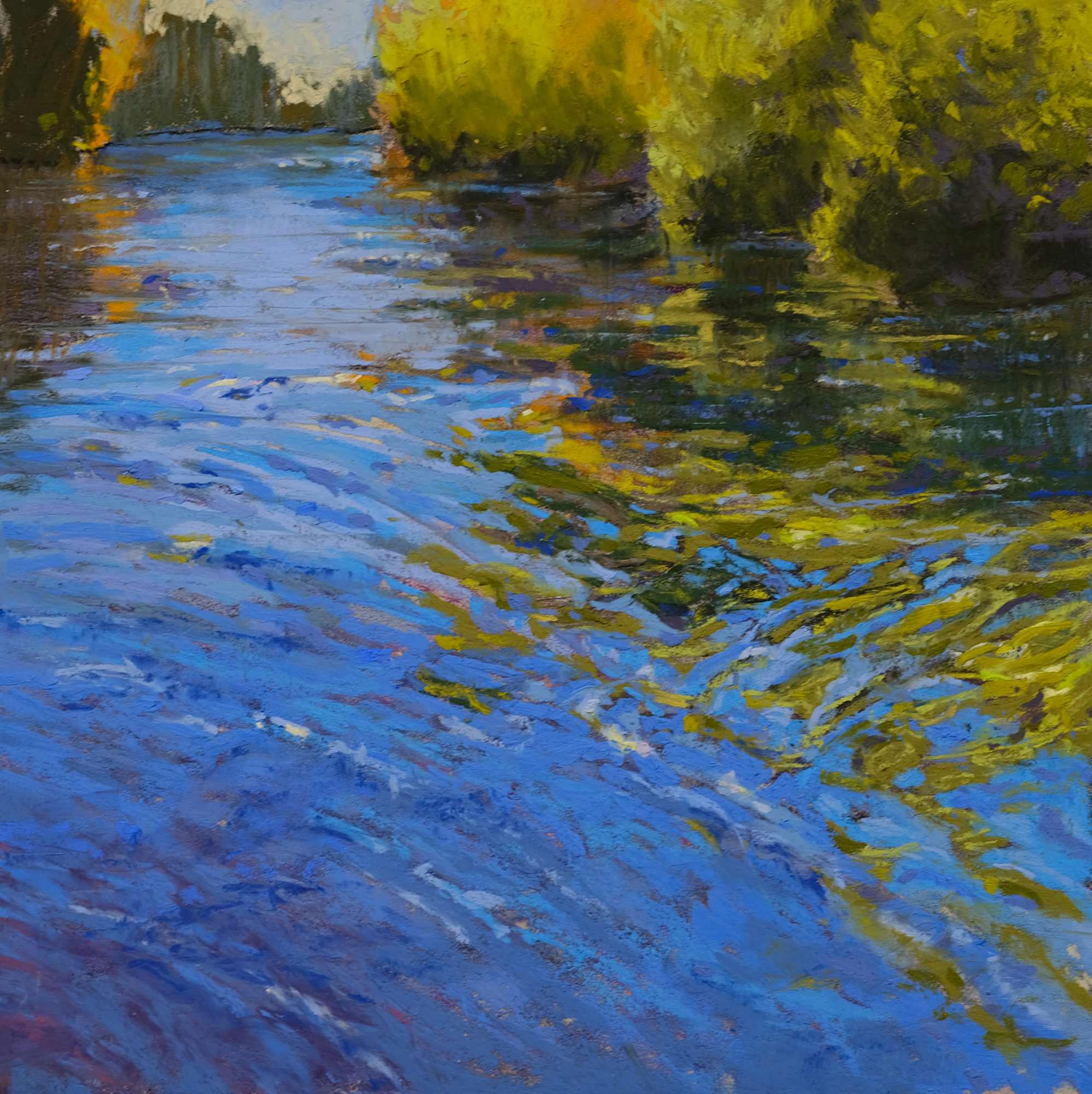 "Melody of Reflections" is my compact yet powerful exploration of a river scene captured in a 12x12 pastel artwork. I emphasize the impressionistic vibrancy of nature, focusing on the dynamic blues of the moving water interspersed with purples and whites. These colors suggest a lively yet serene flow, enhanced by the dramatic reflection of surrounding greenery on the river's surface. On the right, lush green foliage merges seamlessly with the water, offering a vivid display of color and movement. In the background, a subtle echo of trees against a soft sky provides depth and a tranquil atmosphere to the composition. The strength of my artwork lies in its bold, expressive brushstrokes, portraying the natural beauty and serene atmosphere of the landscape with clarity and vitality.