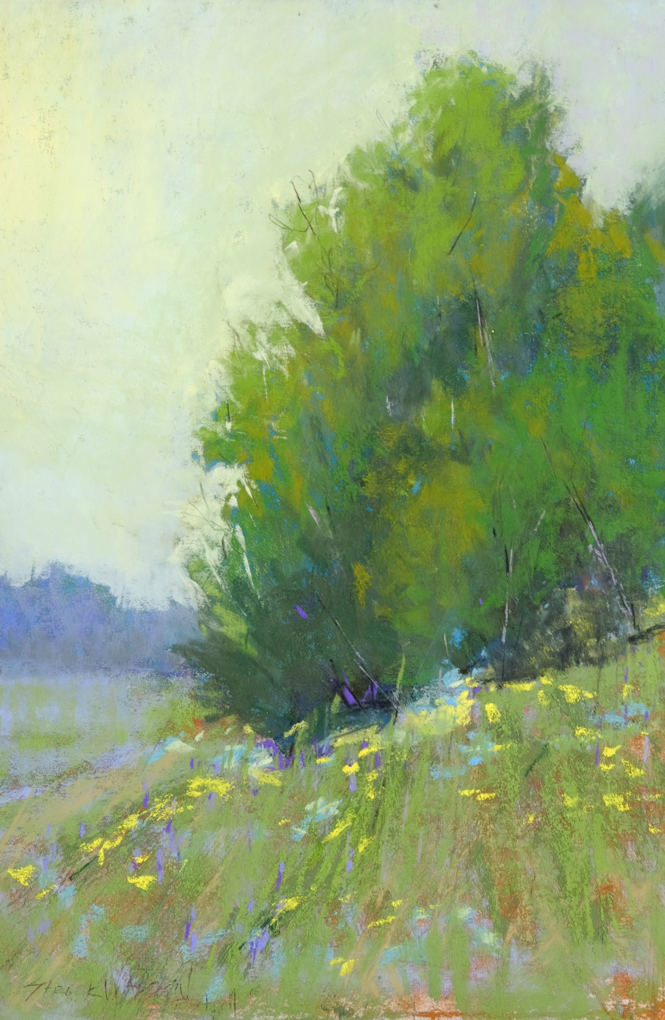 Imagine a scene with a tree on a slight hill and yellow wildflowers on the ground. This is part of my world in Indiana. I may change the flowers the mood of the day or even the colors of the tree.