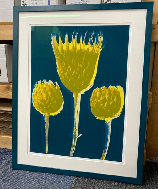 A vibrant botanical print in blues and yellows based on the work of Karl Blossfeldt. Printed on Hahnemuhle photorag fine art paper. Hand painted and waxed frame with True Vue glass UV70. Edition of 5.