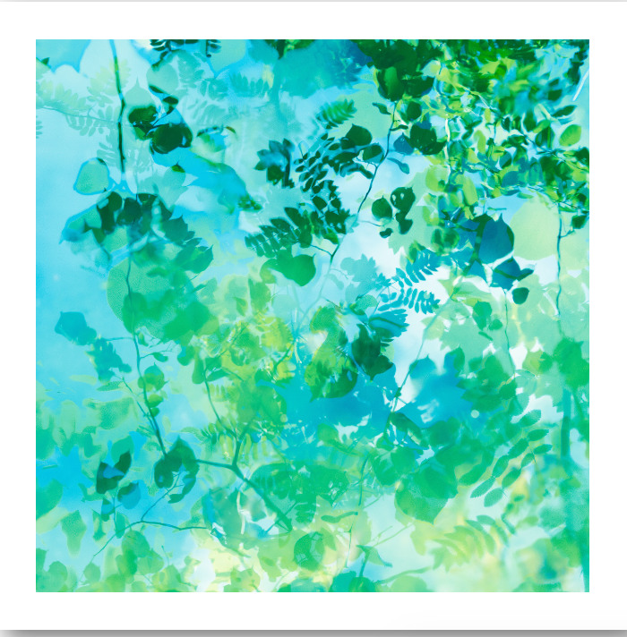 Multiple exposure photography of a pond in spring, capturing leafy patterns and fresh green colours. Printed on fine art Hahnemuhle cotton paper, with a 2.5cm white border to allow for framing. Edition of 5 prints 50x50cm.