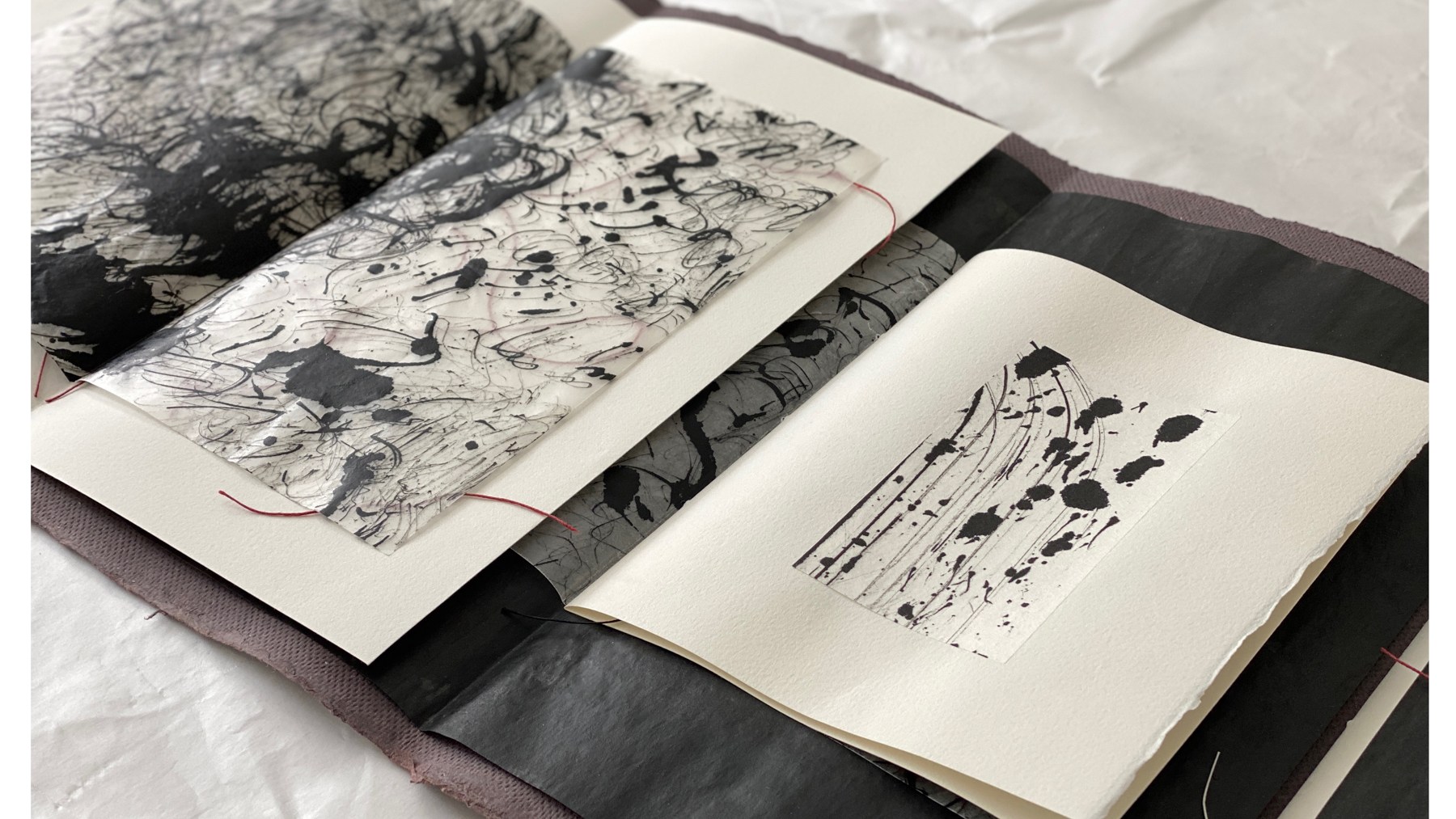 Ink and beeswax on rice paper. Pages of arches velin. Cover Zaansch bord. Triple pamphlet fold structure. Sewn with waxed linen thread.