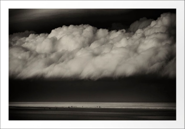 A summer storm on the beach at Camber Sands. An enormous cloud rolls in over the beach as holiday-makers are dwarfed by its size.