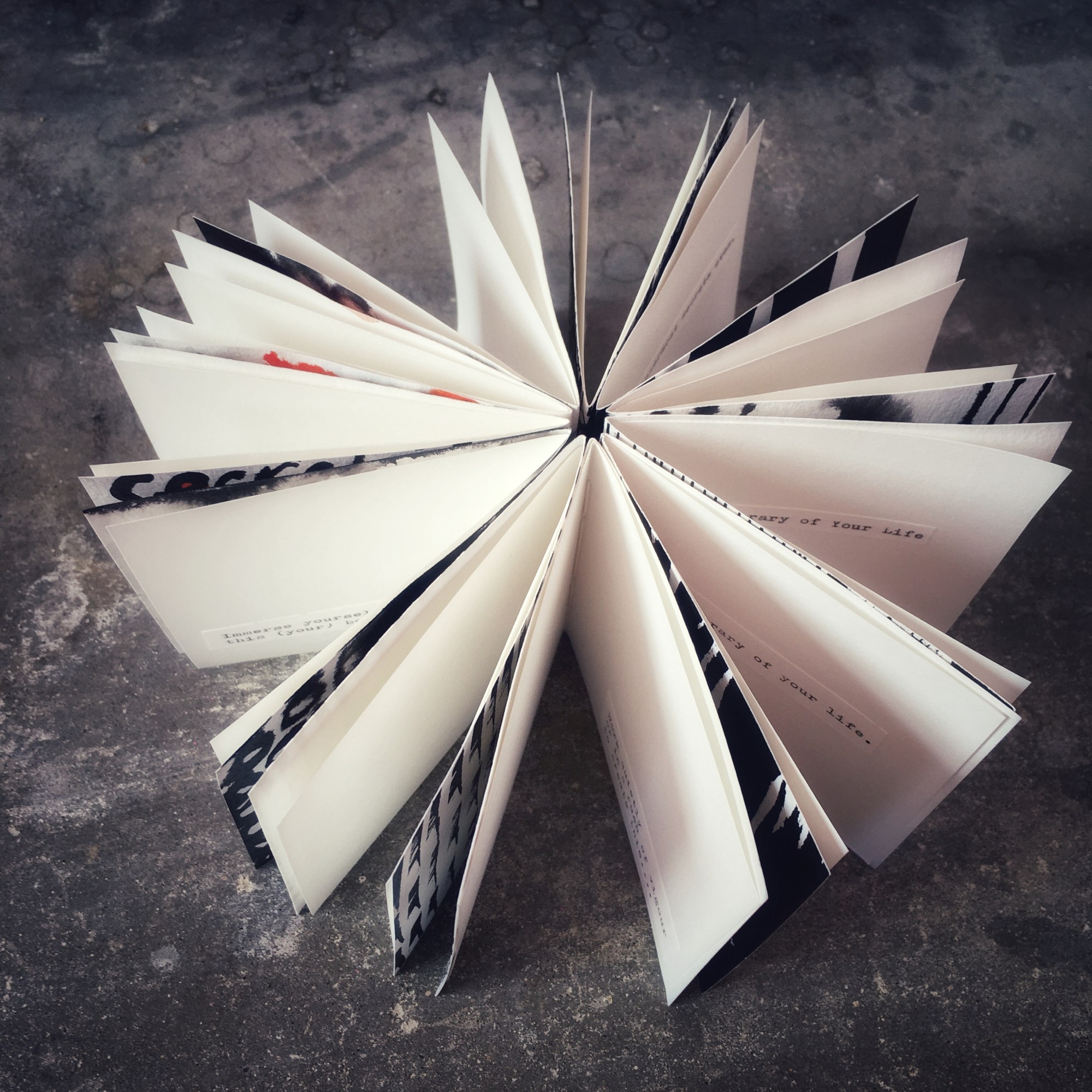 Crowd the page with financial calculations. Paint, draw, scribble, tear, fold. Collect words to place upon the page. Take up your pen and feel the smooth paper slide beneath your hand as you forget the world around you. Immerse yourself in this, (your) book. Savour this time alone between these sheets. Leave your mark in whatever way you choose. Work quietly or in a rush of vigour to create this