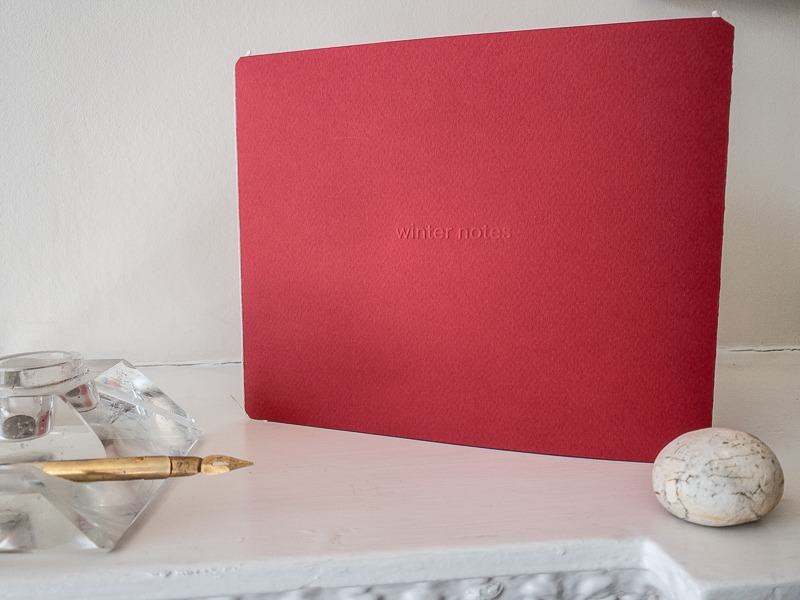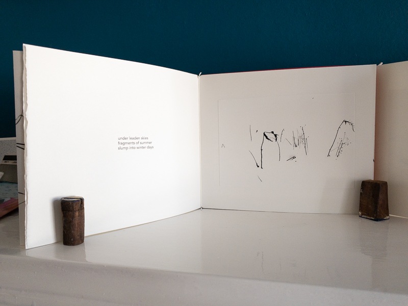 An artist book containing short poems written in response to photographs of plant life in winter in the snow. Fine art photographs in black and white juxtaposed with words. Printed on fine art papers in a triple booklet style with a red embossed cover.