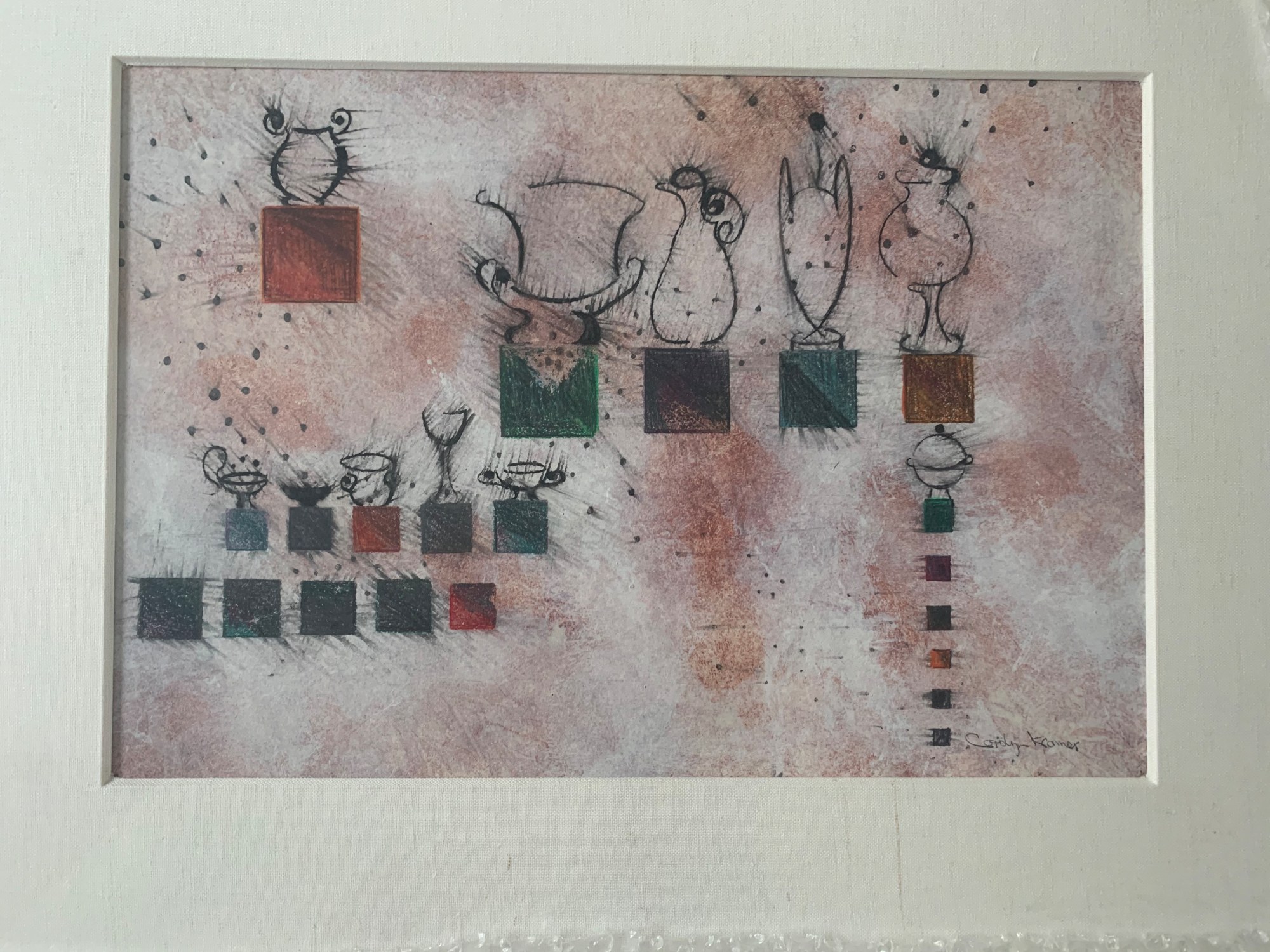 “Ladies In A Row” is a multi media painting and granite drawing. Linear outlines of vessels are playfully presented on pedestals.