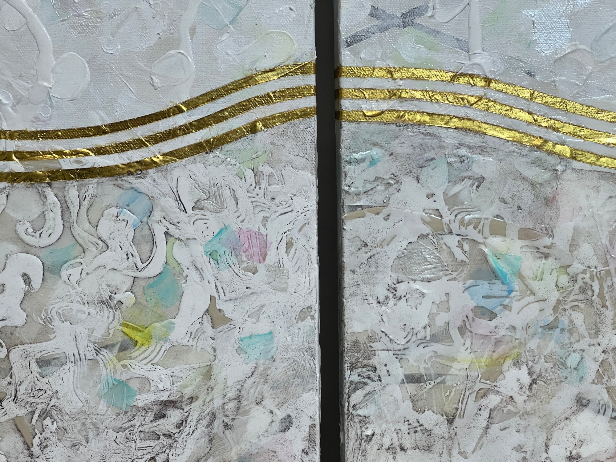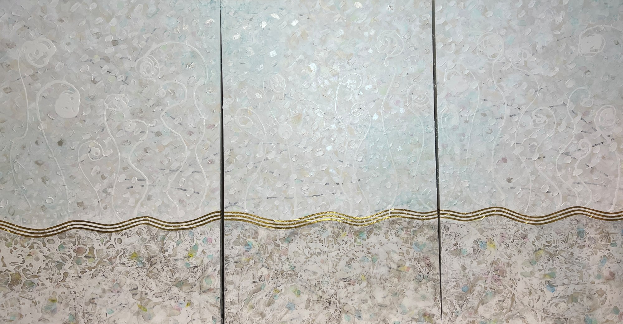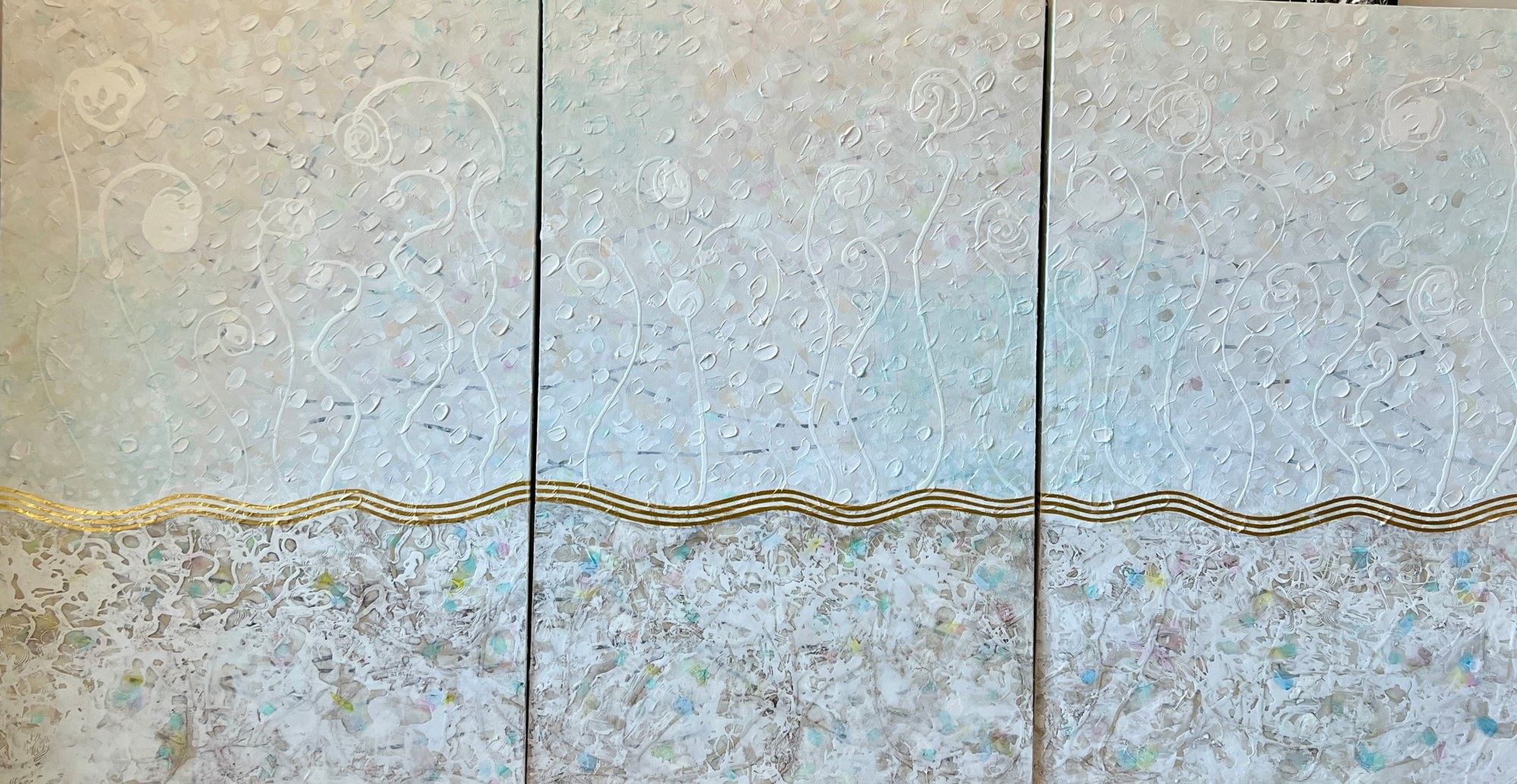 This 108-inch wide artwork is composed of three 30-inch panels. The gold-leaf waves gracefully traverse each canvas and cascade down the 1.5" edges, flowing seamlessly from one panel to the next. This continuity adds a sculptural presence, filling the space with a spiritual energy that is both elegant and peaceful.