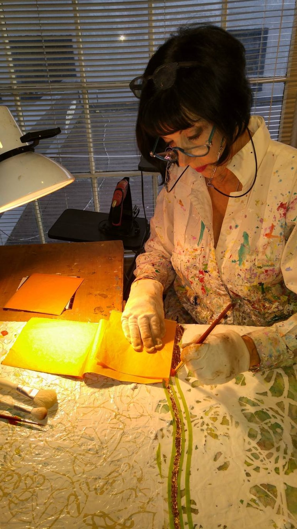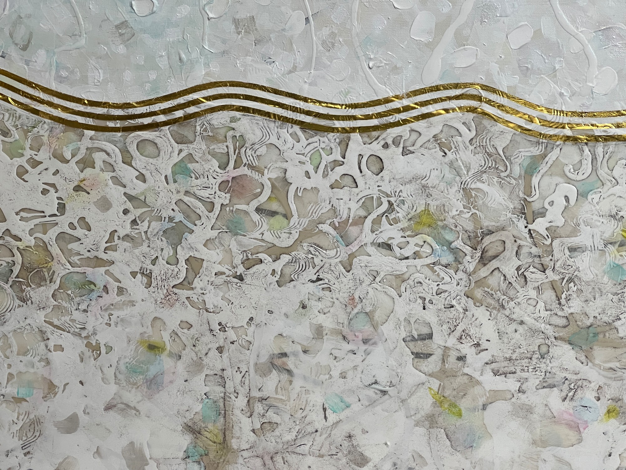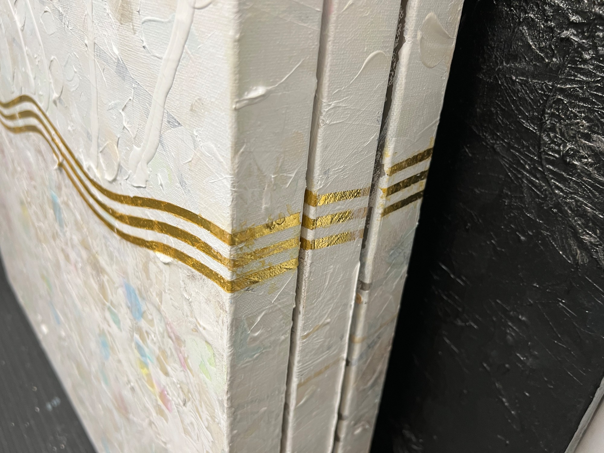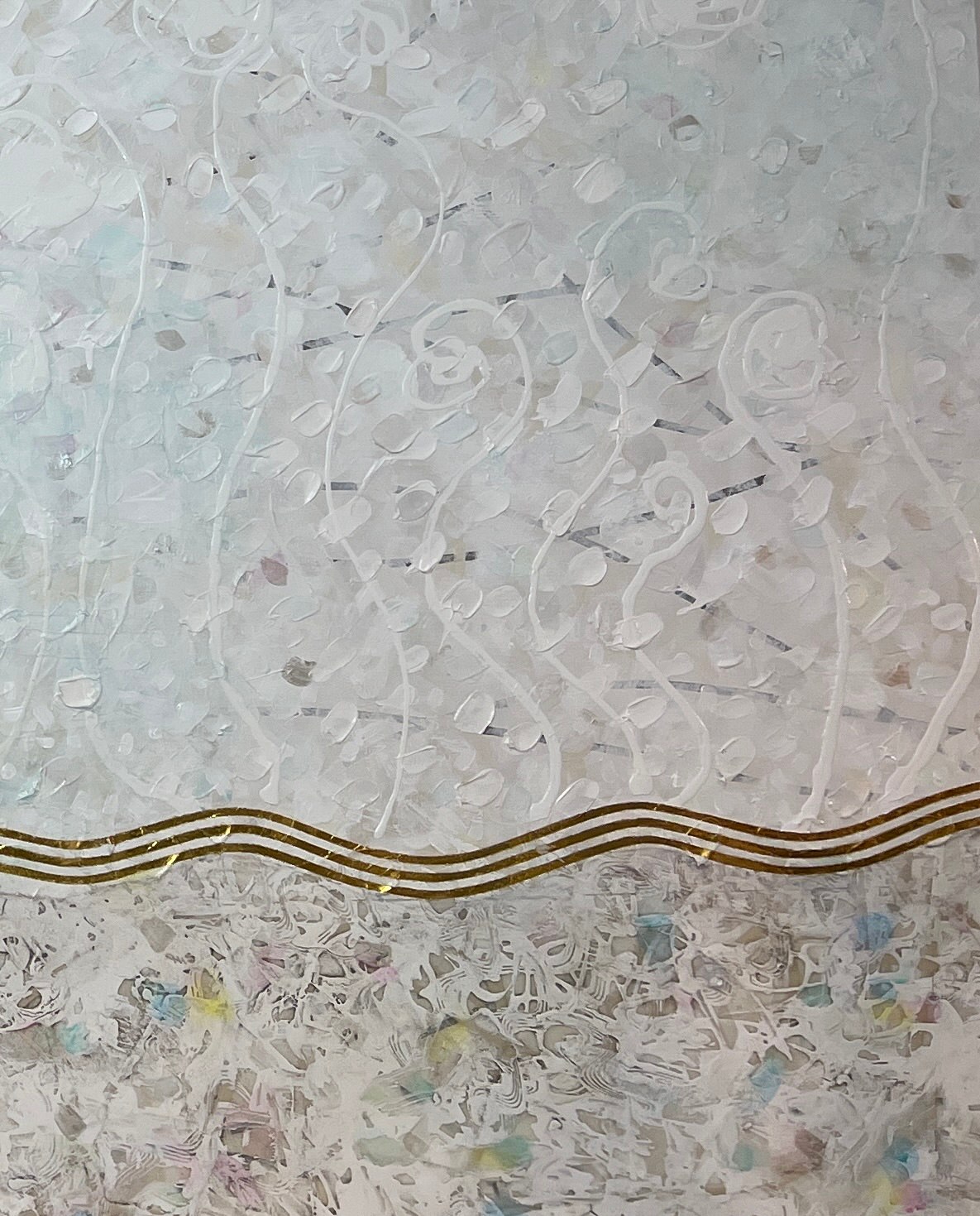 This 108-inch wide artwork is composed of three 30-inch panels. The gold-leaf waves gracefully traverse each canvas and cascade down the 1.5" edges, flowing seamlessly from one panel to the next. This continuity adds a sculptural presence, filling the space with a spiritual energy that is both elegant and peaceful.