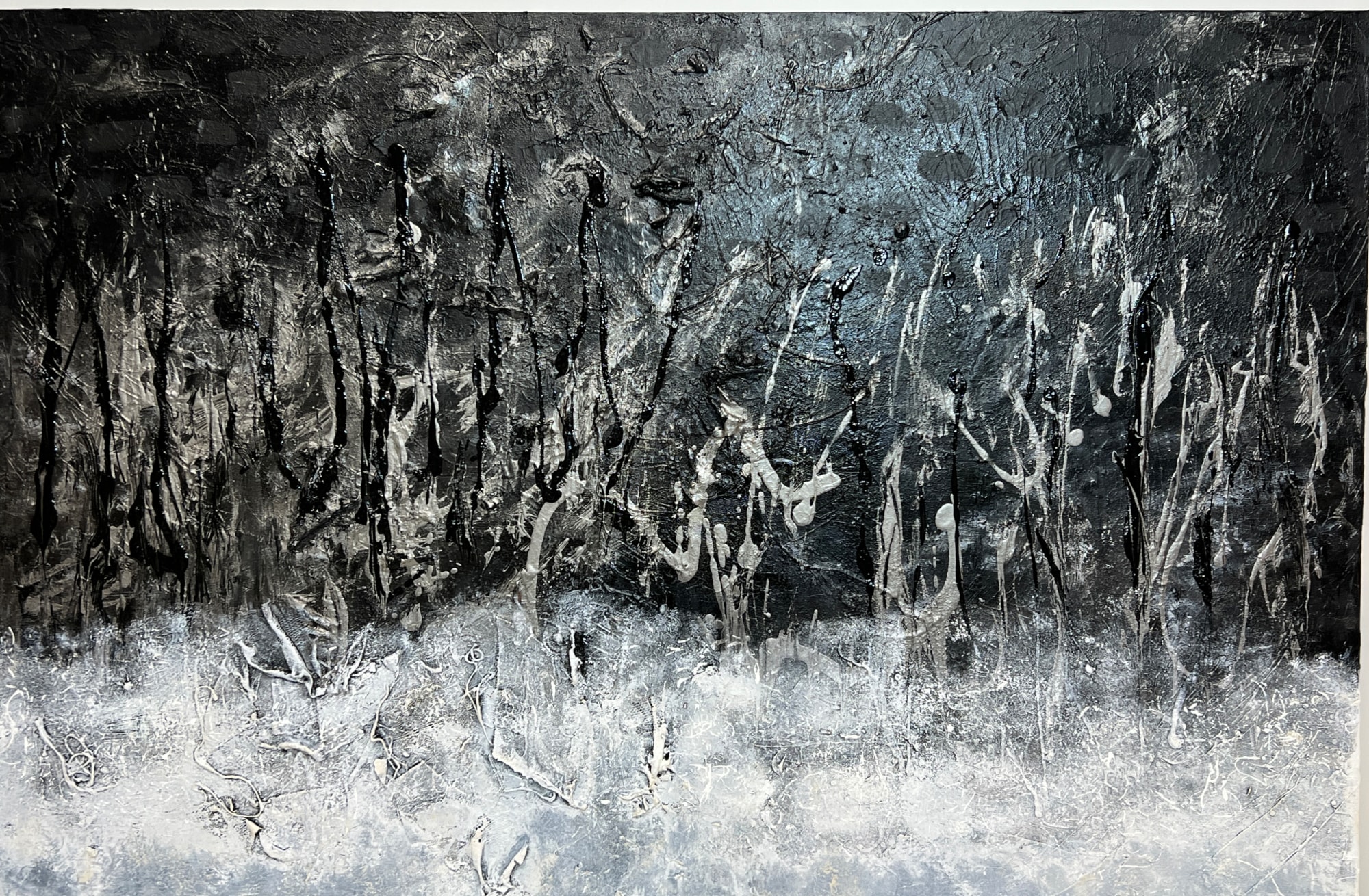 My nature-based painting expresses both dramatic and serene sensibilities. The silhouette of a midnight sky and darkened forest is interpreted through strata-like layers of flowing paint and richly textured, scrubbed surfaces. Whimsical washes and delicate string imprints evoke the quiet beauty of freshly fallen snow, offering a visual meditation on the natural world.