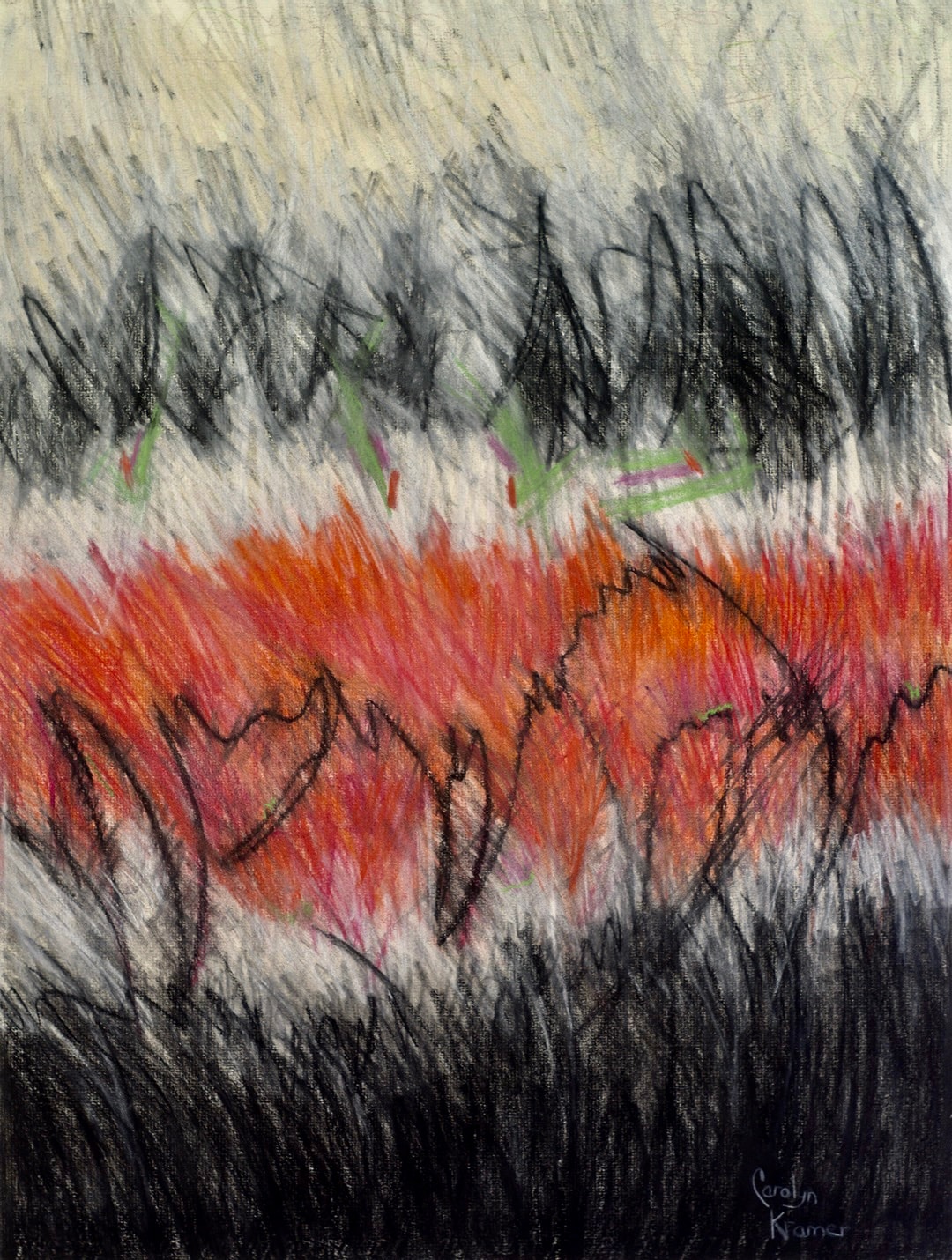 If one could color the sound of jazz, it would be this vivd soft chalk pastel drawing. Brilliant shades of orange, hot pinks and bright reds are woven through soft shades of black and creamy white pastes.
