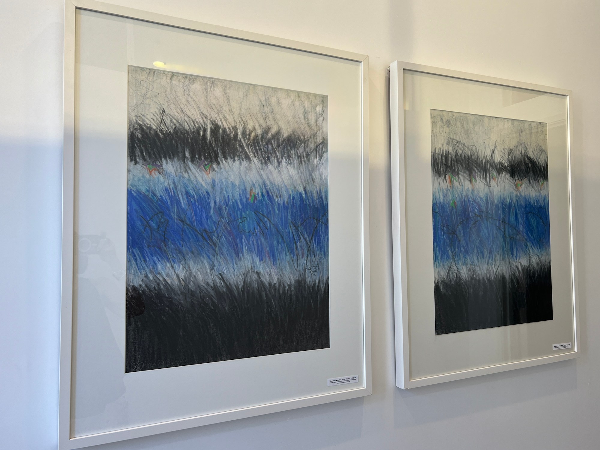 This diptych composition is drawn in layered chalk pastels—gestural scribbles of cobalt and sapphire blues, velvet blacks, and smudged white create a richly textured surface. The piece invites viewers to feel the atmosphere of mountain strata and flowing water, distilled into soulful, ethereal form.