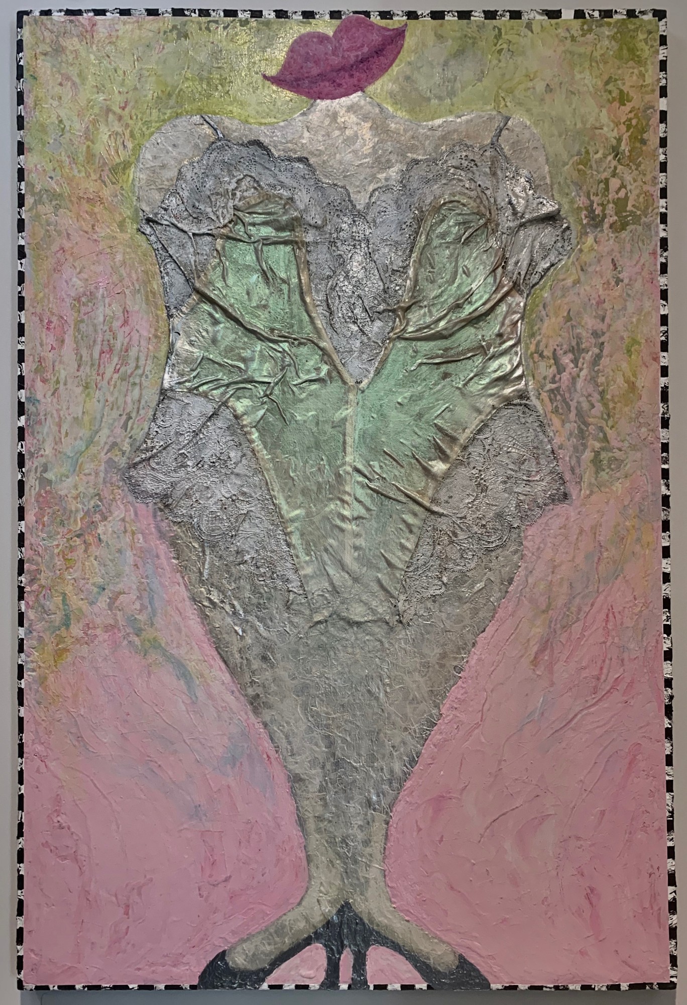 An actual lace teddy is collaged onto a stretched canvas and re-worked with shiny acrylic paints and textured papers to create this joyful pink lipped and high heeled "Sassy Lady."