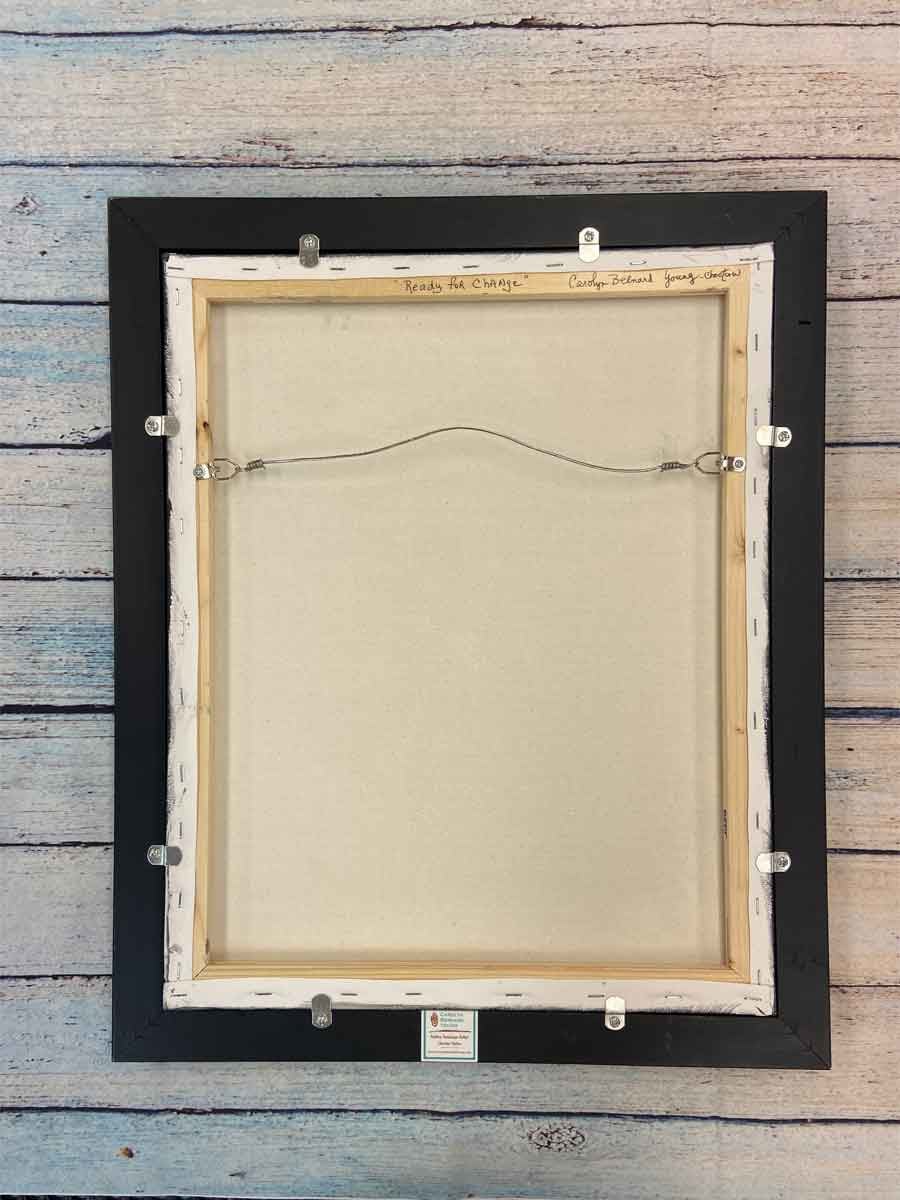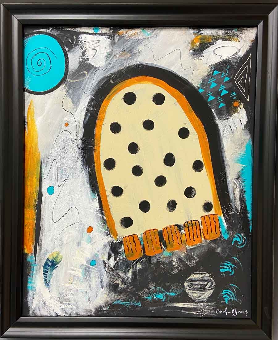 Created on a 16 x 20 canvas, using acrylic paints, inks, hand-carved stamps and collage. Multiple coats of non-yellowing, water resistant medium are applied to seal and protect the painting. It is framed simply in a black wooden frame.