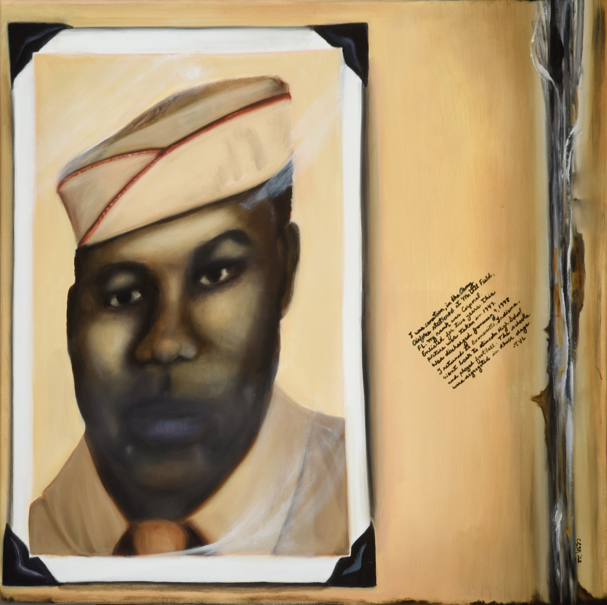 My friend found an old photograph of himself taken 75 years ago as a young army recruit who survived World War II. To get into the army, which was still segregated, the young man lied about his age. (He was only 14.) In the photo and the painting, he seems not yet completely in synch with being a soldier.