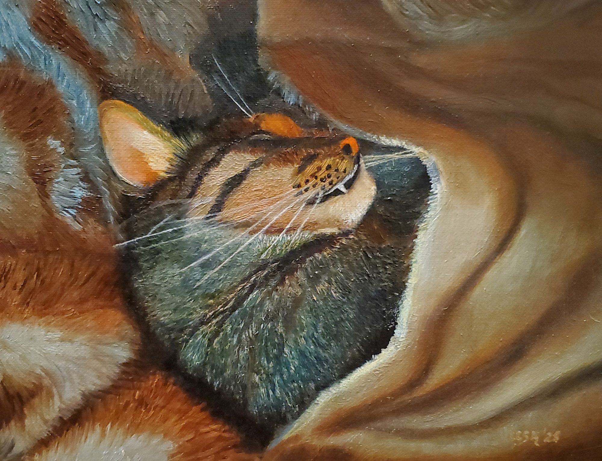 This little cat was found and given a loving home, a new life in LA. I tried to paint his feelings of happiness and safety as he slept, wrapped up in his "blankies".