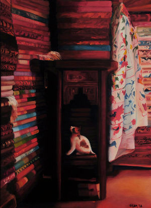 This painting shows the interior of a carpet shop in Istanbul, Turkey, full of colorful carpeting and bolts of cloth. Apparently, cats have curiosity regardless of borders.