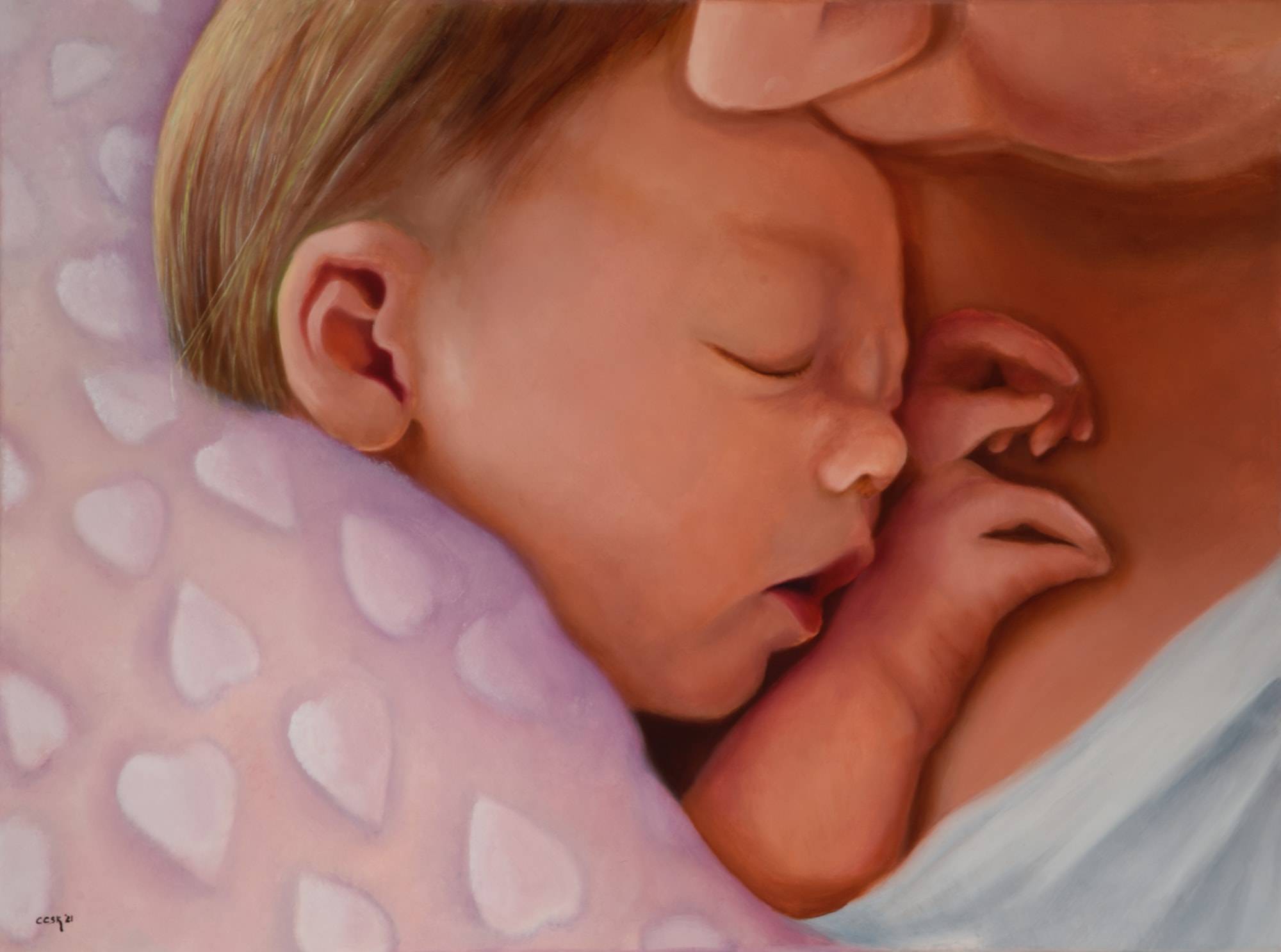 A newborn baby girl, with a pink blanket, asleep on her mother. (Her mother loves pink.) I have known the parents for more than 15 years, since before they married.