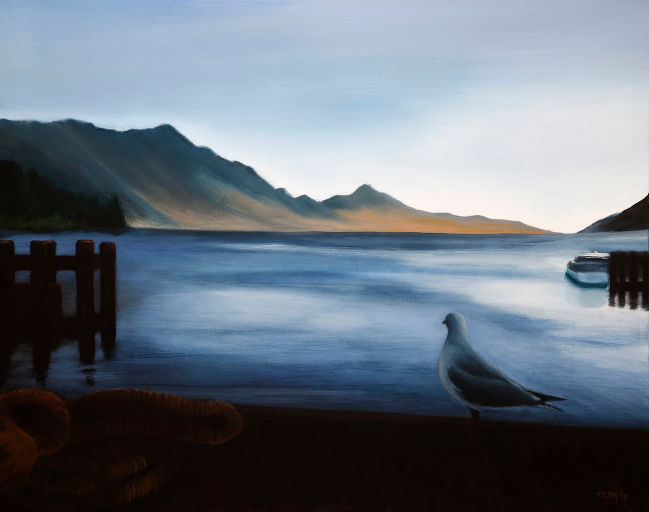 At one of the harbors we stopped in evening was just falling. We stood out on the deck, together with a seagull, and watched the sun go down. The waterways were stunning, the landscape extraordinary. I tried to capture the peace and beauty that stretched out before us.