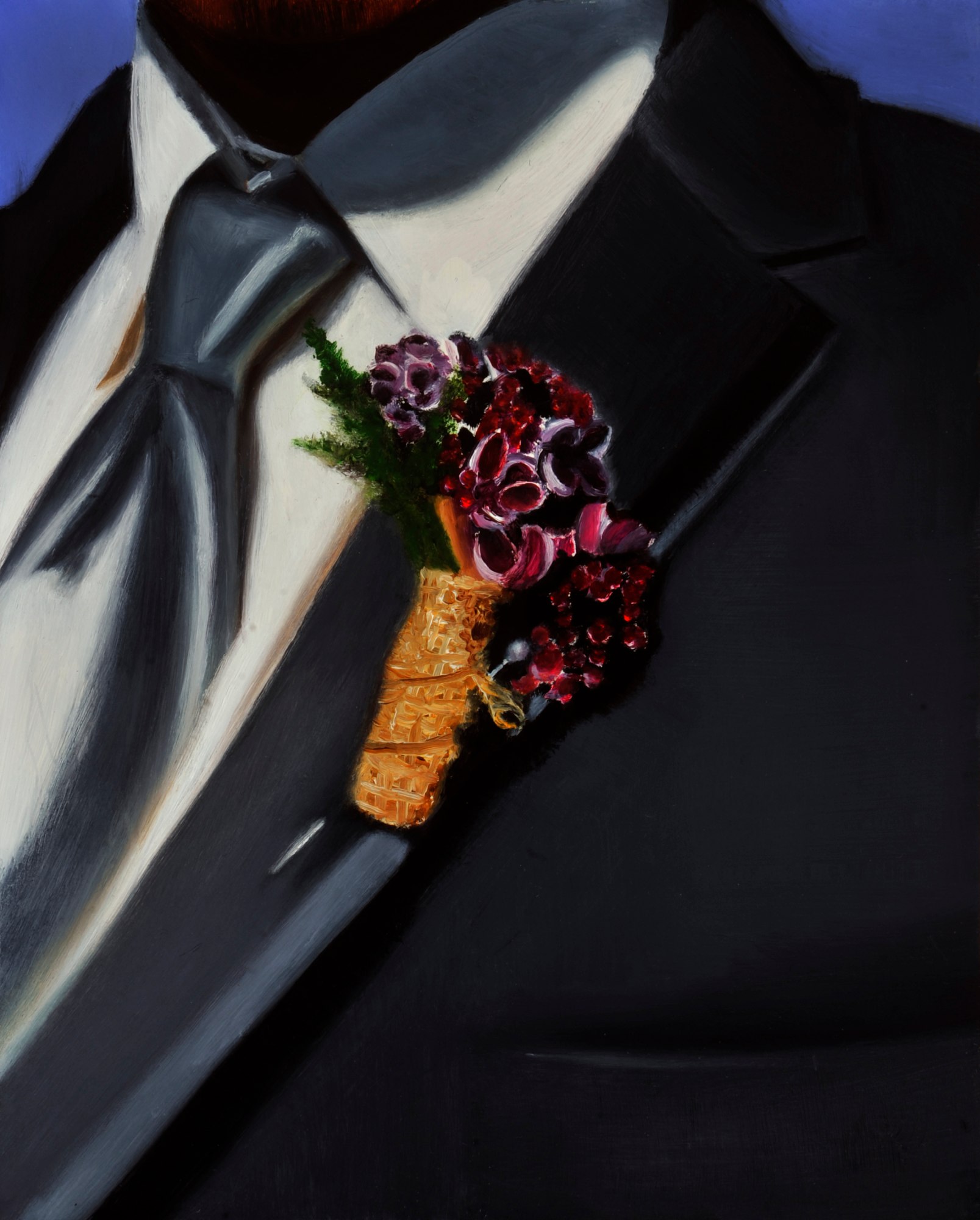 At the wedding of a friend's daughter, on a beach in Oregon, I found a remarkable contrast between the formality of the grooms tuxedo and informality of the boutonnière - a tiny collection of country flowers. The people in attendance were joyous, the sunshine was bright, the venue full of relaxed beauty - the painting seeks to reflect the joy, brightness, and beauty.