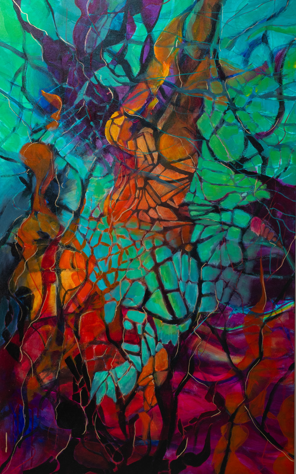 The canvas portrays an eruption of hues, an organic expanse that appears both intricately interconnected and explosively fragmented. The piece mirrors a web—an intricate, pulsating network that hints at the complexity and interconnectedness of the universe, inviting contemplation on the very fabric of existence.