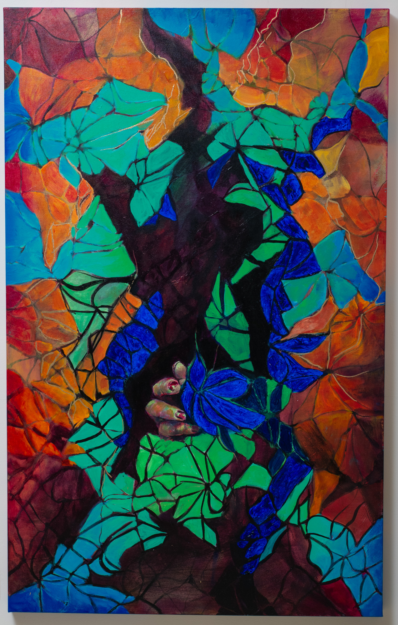 At the heart of the canvas lies an intriguing focal point reminiscent of the enigmatic opening seen in 'Leigh's Song.' Here, amidst the shattered network, emerges an impression of a hand reaching out from the depths, defying the darkness. The convergence of these hues within the artwork creates a symphony of contrasts, suggesting a narrative of emergence and exploration.