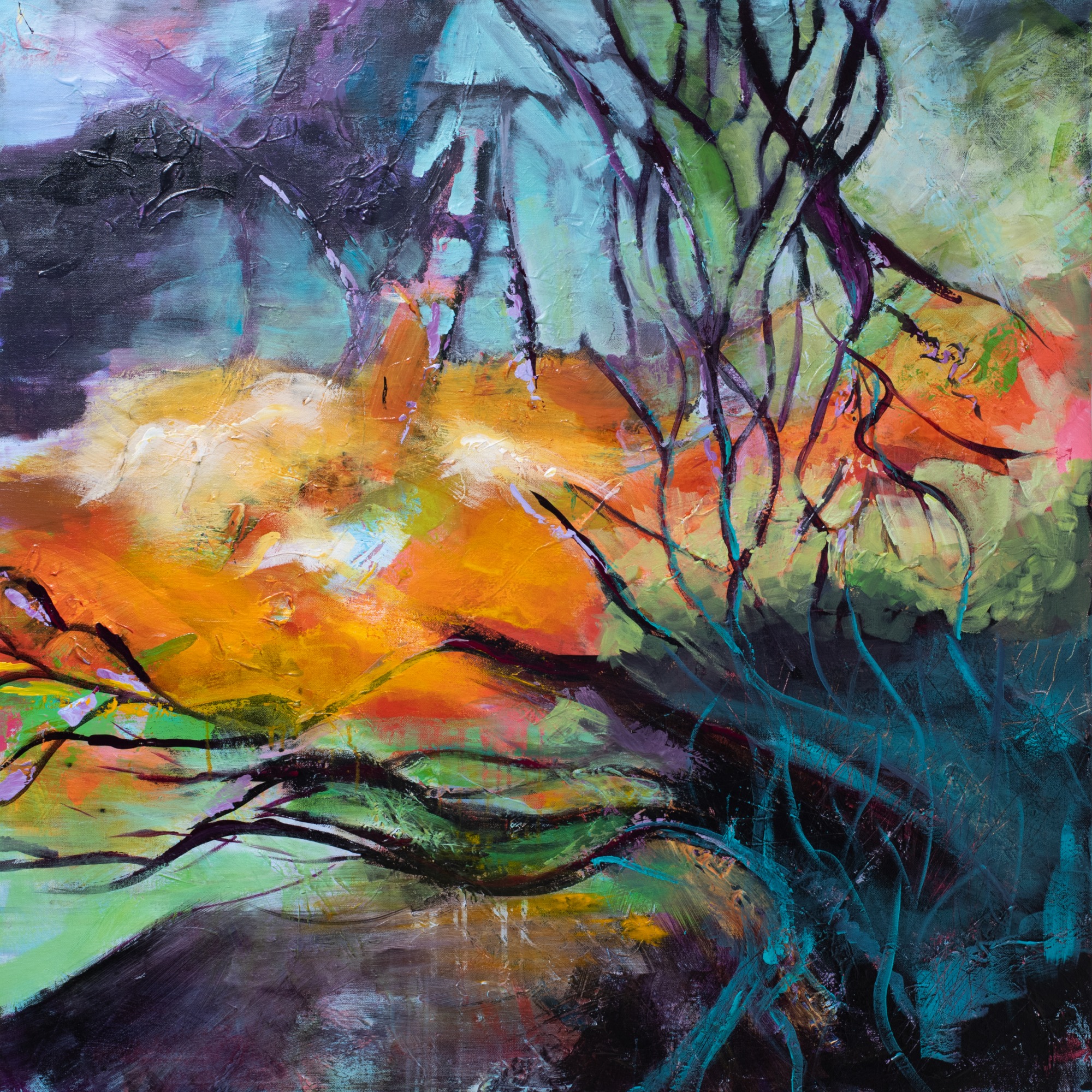 The painting features a blend of serene greens and deep blues, punctuated by a vibrant orange streak that mimics a sunset over a tranquil lake. This contrast introduces a sense of serene yet powerful beauty.