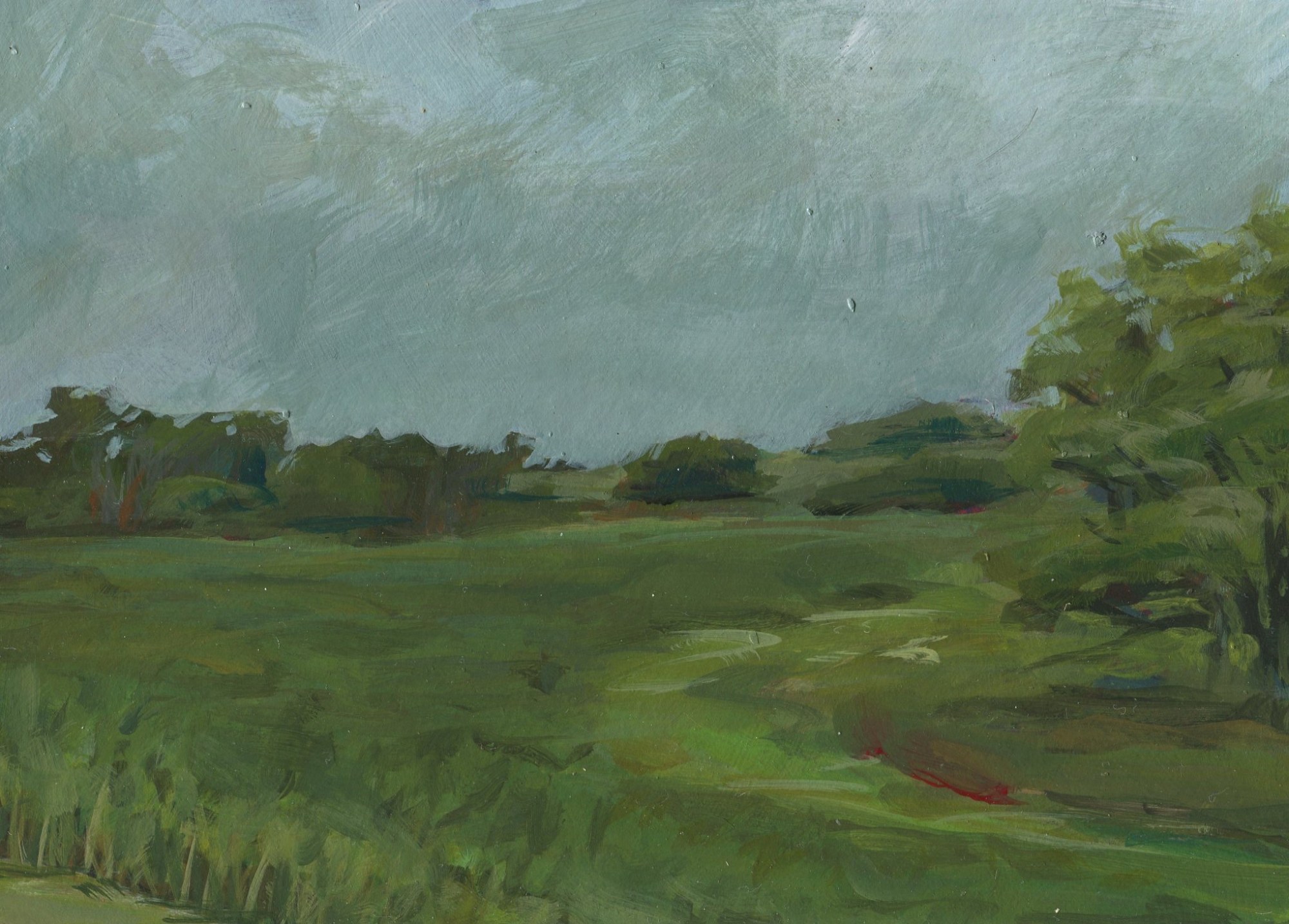 An original plein air landscape painting, done entirely on location in Kandiyohi, MN. Painted in acrylic on primed archival paper and varnished with a gloss finish.