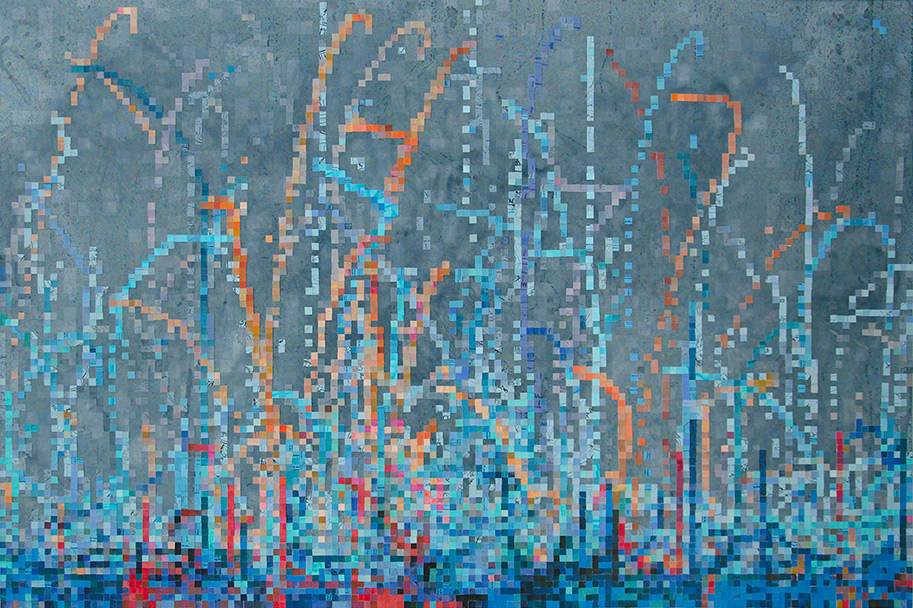 Acrylic paint, inkjet, cut paper & protective varnish on canvas over panel