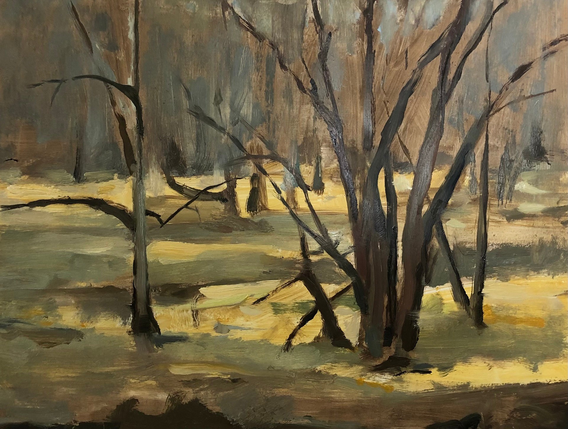 This piece was painted at The Brandywine River Museum in Chadds Ford Pennsylvania. Artists were invited to paint the outdoors from indoors, through the huge glass walls overlooking the Brandywine River. This is an excellent opportunity for me because I am opposed to the cold. There was no snow this day in February. I painted what I saw, across the river to the woods beyond.