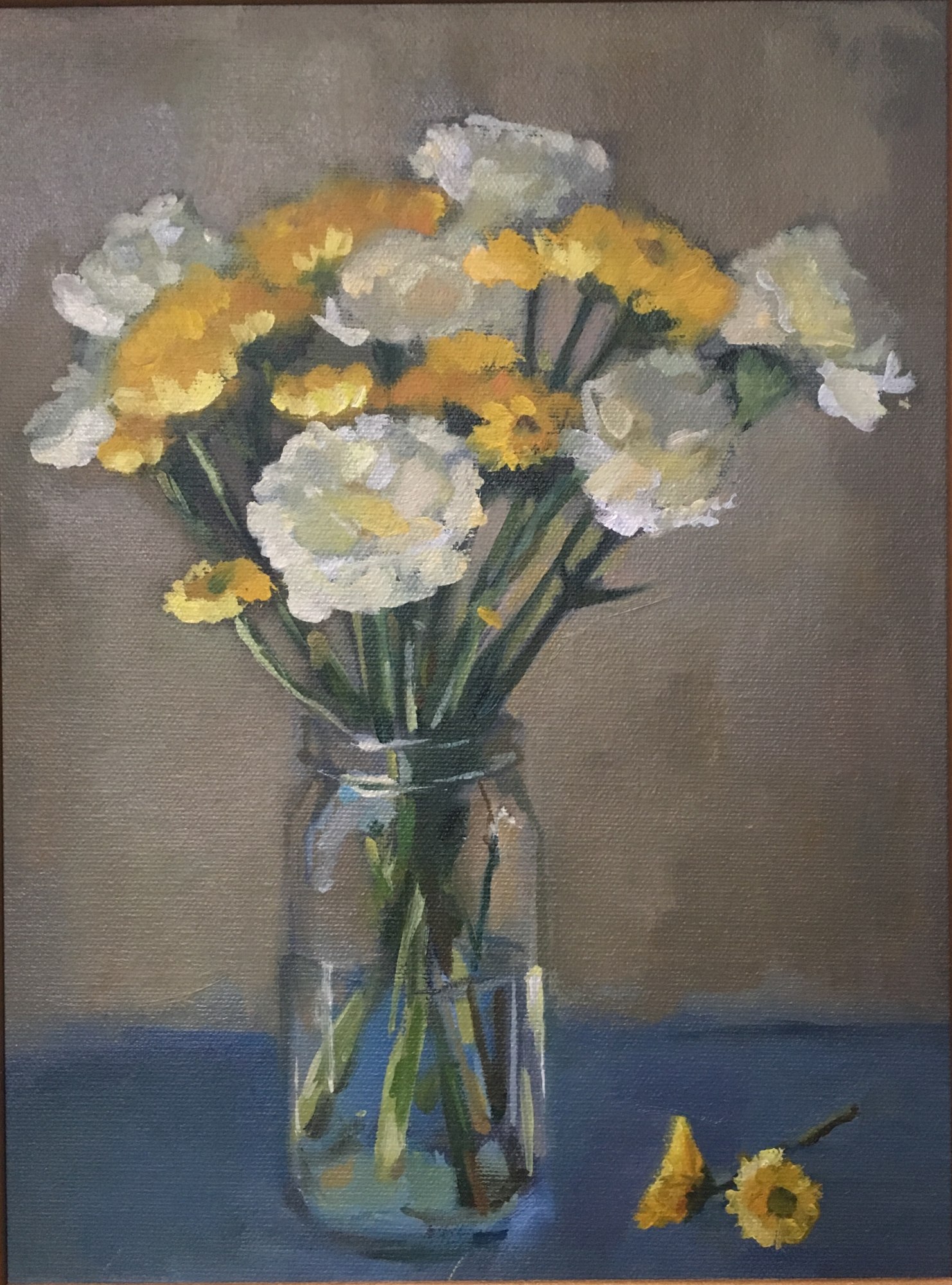 Ball Jar with Yellow and White  Image: White carnations and yellow mums in a simple ball jar.