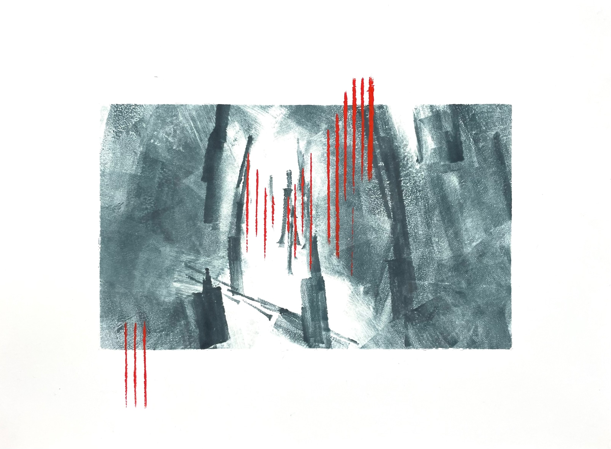 Ink monotype and acrylic. 9” x 6” image on 15” x 11” BFK Rives paper.