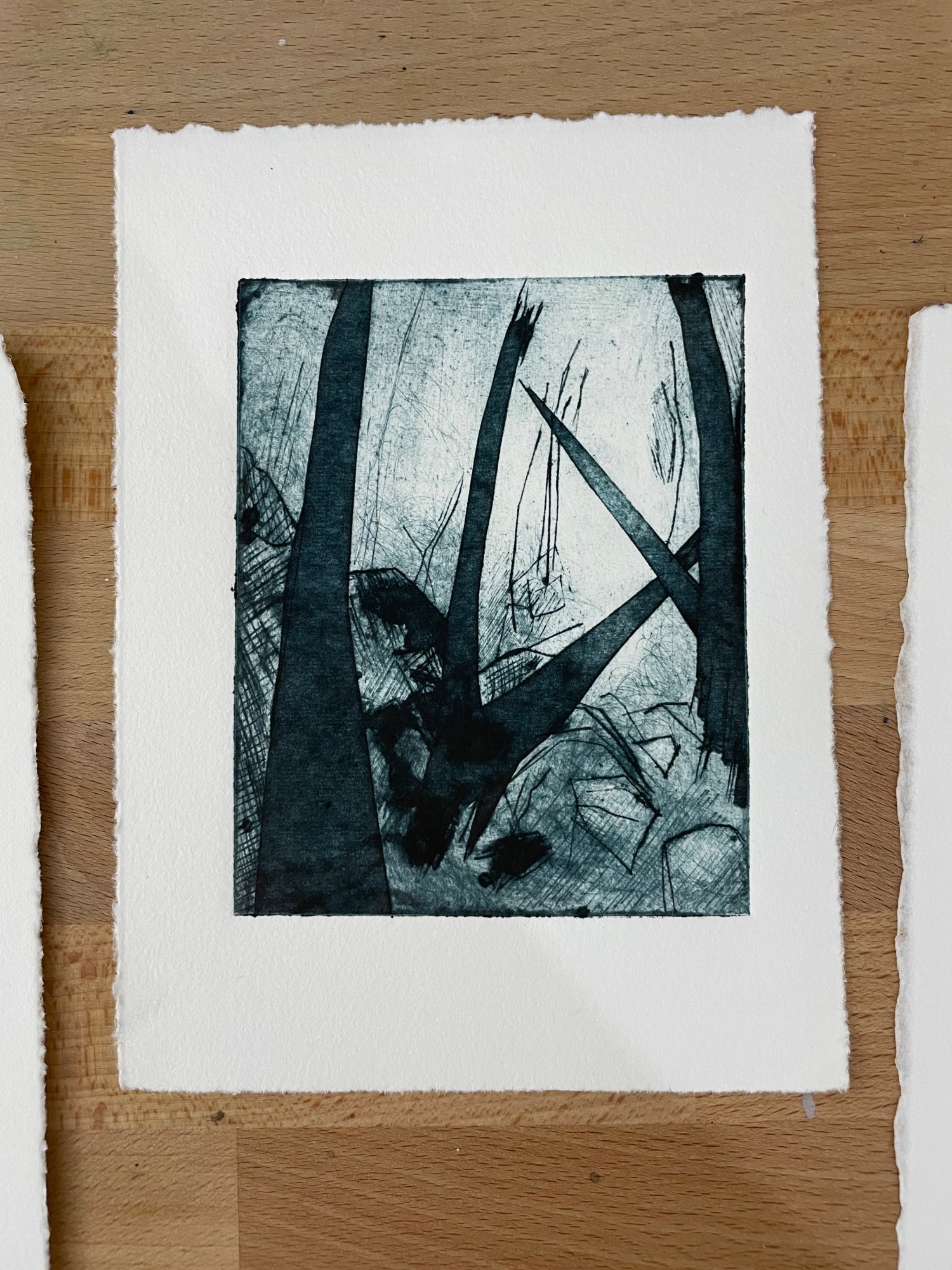 Three-print triptych consisting of three monoprints from a single collograph plate with drypoint. Images are 4” x 5” on 5.5” x 7.5” BFK Rives paper.