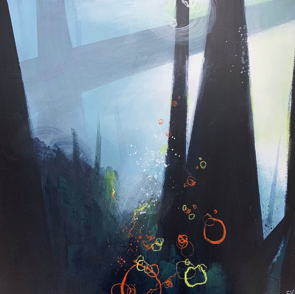 Mixed media on 18” x 18” x 1.5” cradled wood panel.