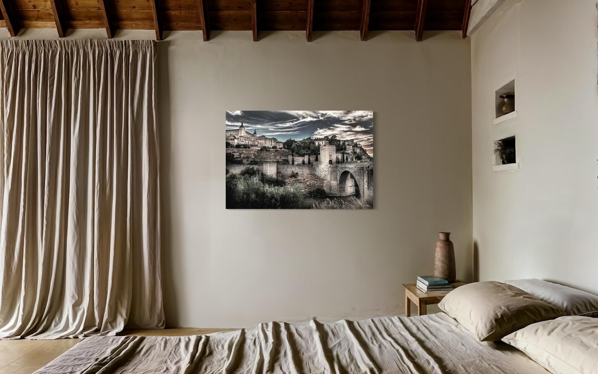 MessageToledo is a dramatic photographic depiction of the magnificent walled city of Toledo, Spain, and the Tangus River, captured in 2021. This historic city, with over 2,000 years of history, served as the capital of the Visigothic kingdom from 542 to 725 CE and was the temporary seat of power for Charles V in the 16th century. The image showcases the fortified walls and prominent arched bridge spanning the river, highlighting the blend of medieval and Renaissance architecture. Presented as an original print on backlit canvas, it is mounted in a removable aluminum frame over a Lumigrid LED light panel with dimmable lighting, enhancing the atmospheric textures and timeless quality of the scene.