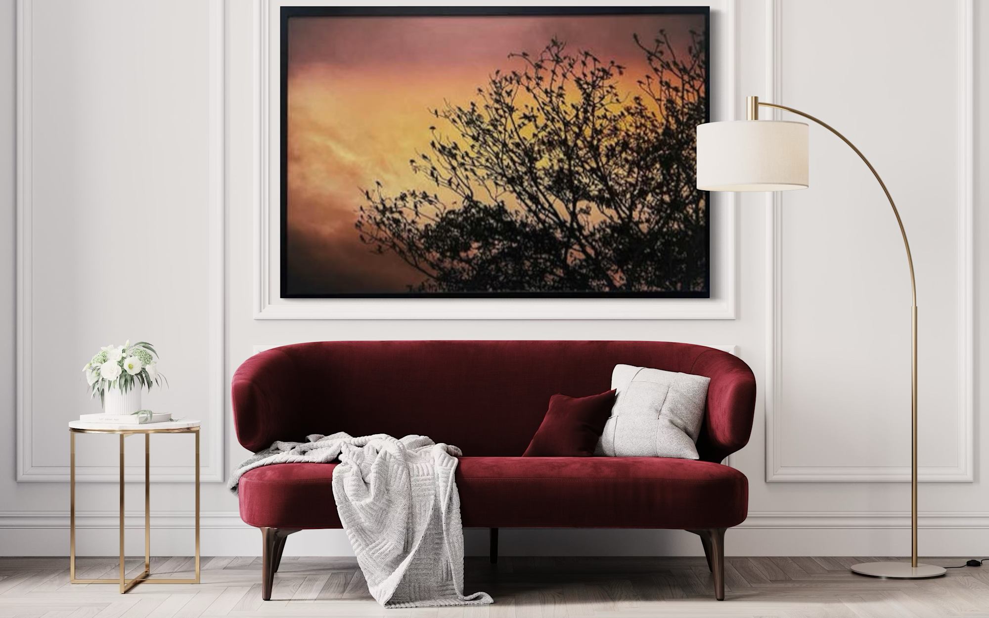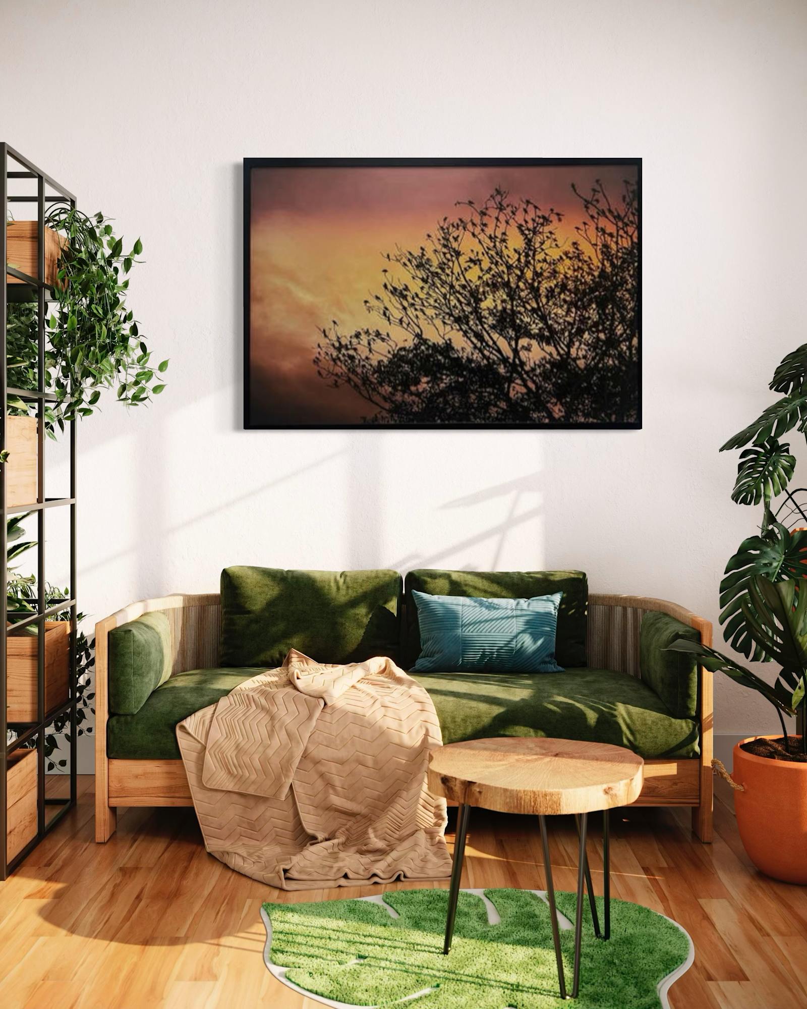 Crowded is a photographic study of natural forms silhouetted against a shifting sky. The image focuses on the dense tangle of tree branches, their outlines sharply defined by the diminishing light. Birds cluster tightly along the limbs, creating a textured surface that contrasts with the open expanse behind. The sky moves from a soft purple to a warm golden tone, offering a subtle yet vivid backdrop that brings depth and atmosphere to the scene. The composition captures a quiet moment of transition, emphasizing the balance between complexity and calm found in nature’s patterns. Photographed in Isamál, Mexico, 2020, this original photograph is printed on William Turner photo paper and mounted on a solid wood frame with non-reflective art glass. The price of this original photograph is 25,000 Mexican pesos, which is approximately $1,200 US equivalent. Please contact the artist via Casa Roja Art for further information.