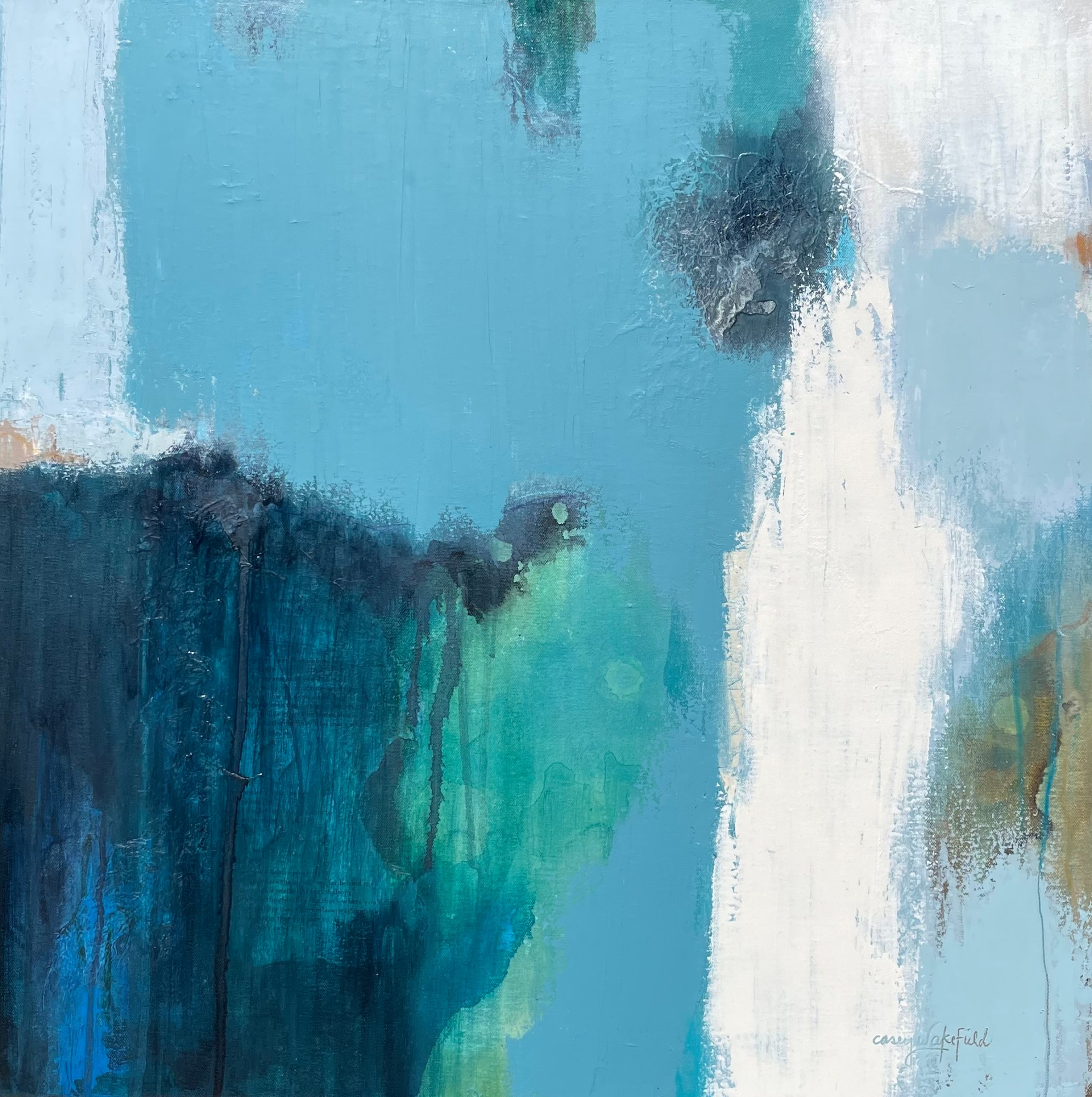 Wakefield creates color impressions in abstract form through a contemplative transformation of colors, drips, and marks onto canvas with mixed media and oil.