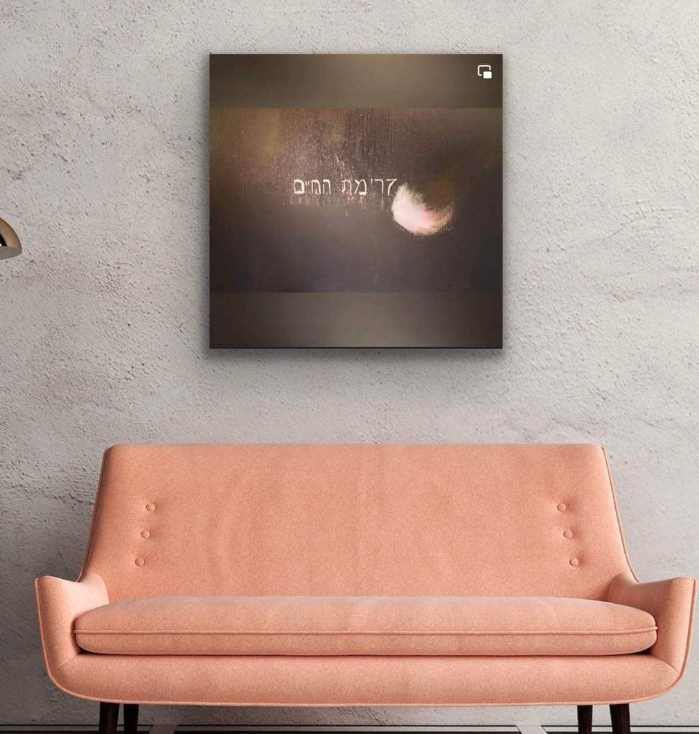 Delving into the ancient allure of Hebrew script, this piece, ‘זרם החיים’, or ‘The Flow of Life’, speaks to the sacredness of existence and the fragile delicacy of humanity. Set against a rich, earthen backdrop, the stone-like script stands as a timeless testament, reminding us to respect the sanctity of life. Amidst the shadows, a feather delicately brushed with a hint of pink emerges, symbolizing the ethereal quality of hope and the lightness of spirit.
