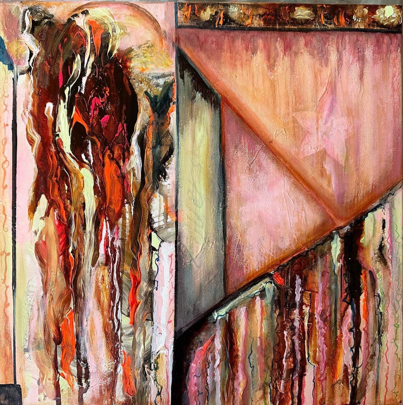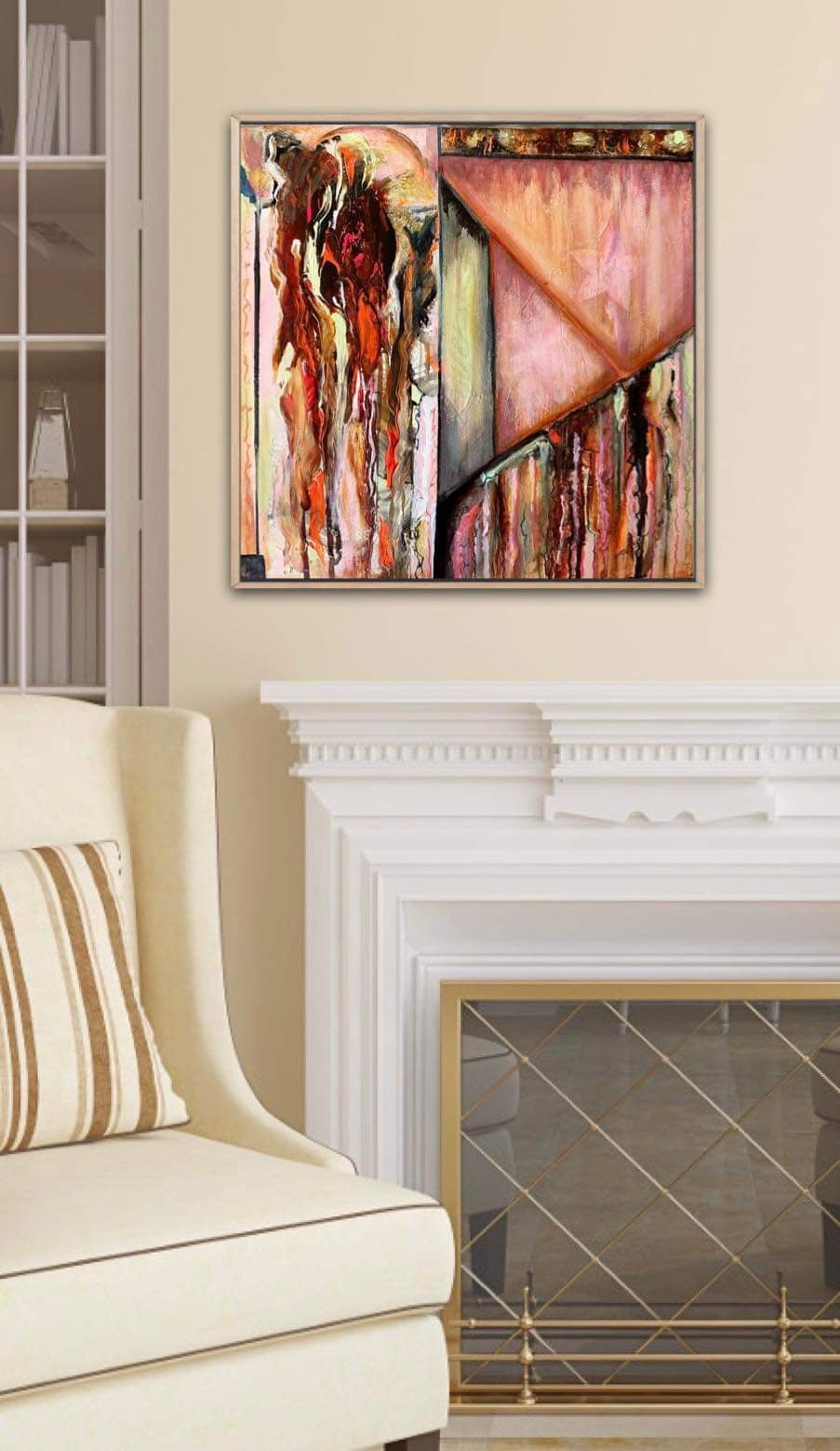 ‘Par Amour,’a 16 x 16 abstract acrylic tableau, captures the ephemeral essence of love’s fire and the tender sanctuary of romance. The rich reds and warm pinks converge in a dance of color, reminiscent of two hearts alight, while soft greens and sun-kissed yellows offer a gentle embrace akin to lovers entwined. The left vertical third, a visual allegory for unity, suggests the silhouette of a couple melting into a sunset—or is it a moonrise?—each interpretation valid, each as intimate as the next. The rest of the canvas, a mosaic of geometrical passion, invites eyes to wander over the angles and intersections, symbolizing love’s multifaceted journey. This piece is not just a visual spectacle but an homage to the singular moments shared between two souls, against the canvas of the world. It beckons the discerning collector to pause and reflect on the fires of their own passions and the quietude of their deepest affections, making it a perfect conversation piece that resonates with the heart’s own story.