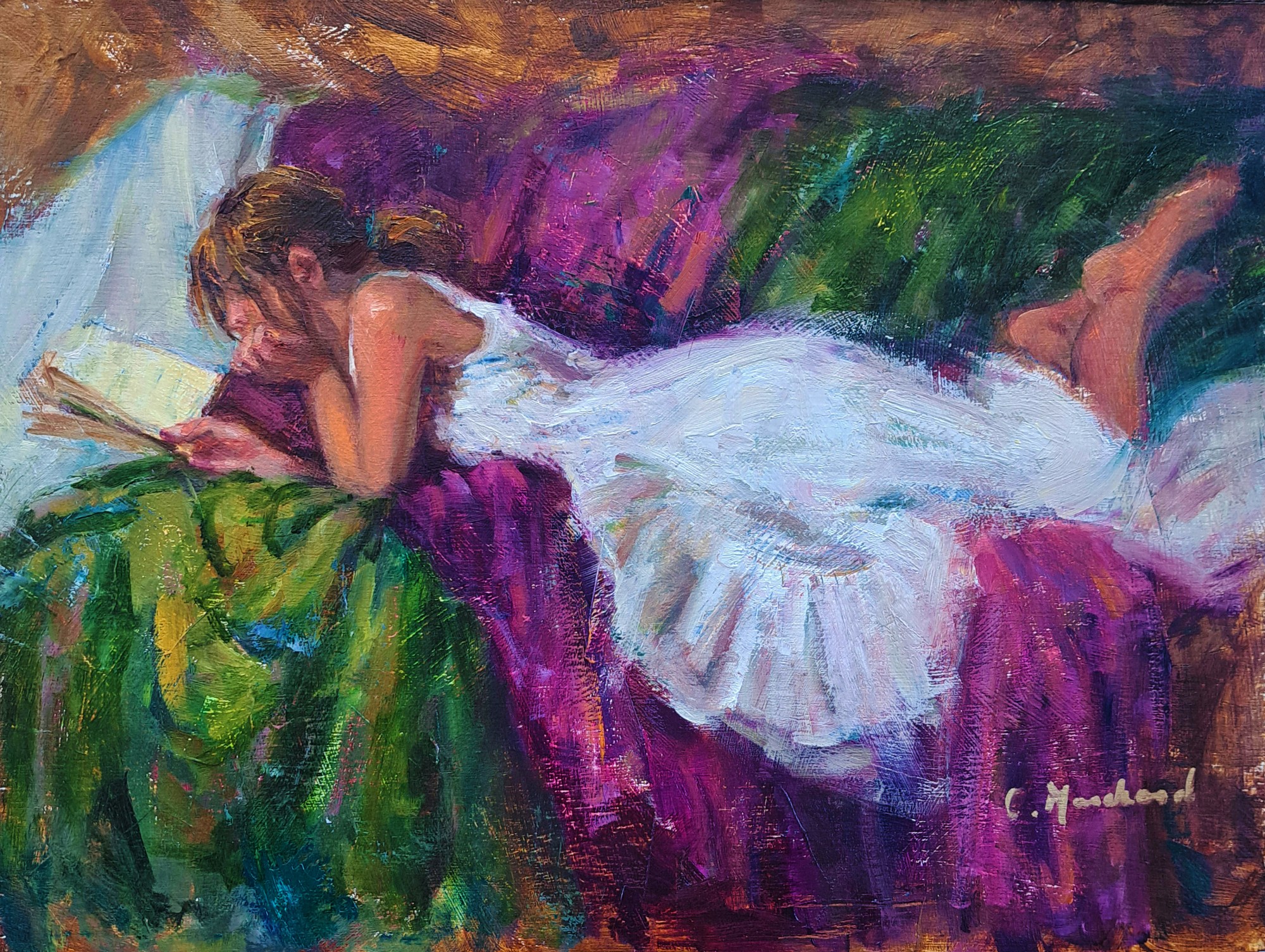 Everyone can relate to spending time with a good book and this young woman is lost in her imagination. I wanted to bring a lot of color and life making this figurative painting realistic yet more creative using bolder color and brush strokes hopefully making this more energetic than realistic.