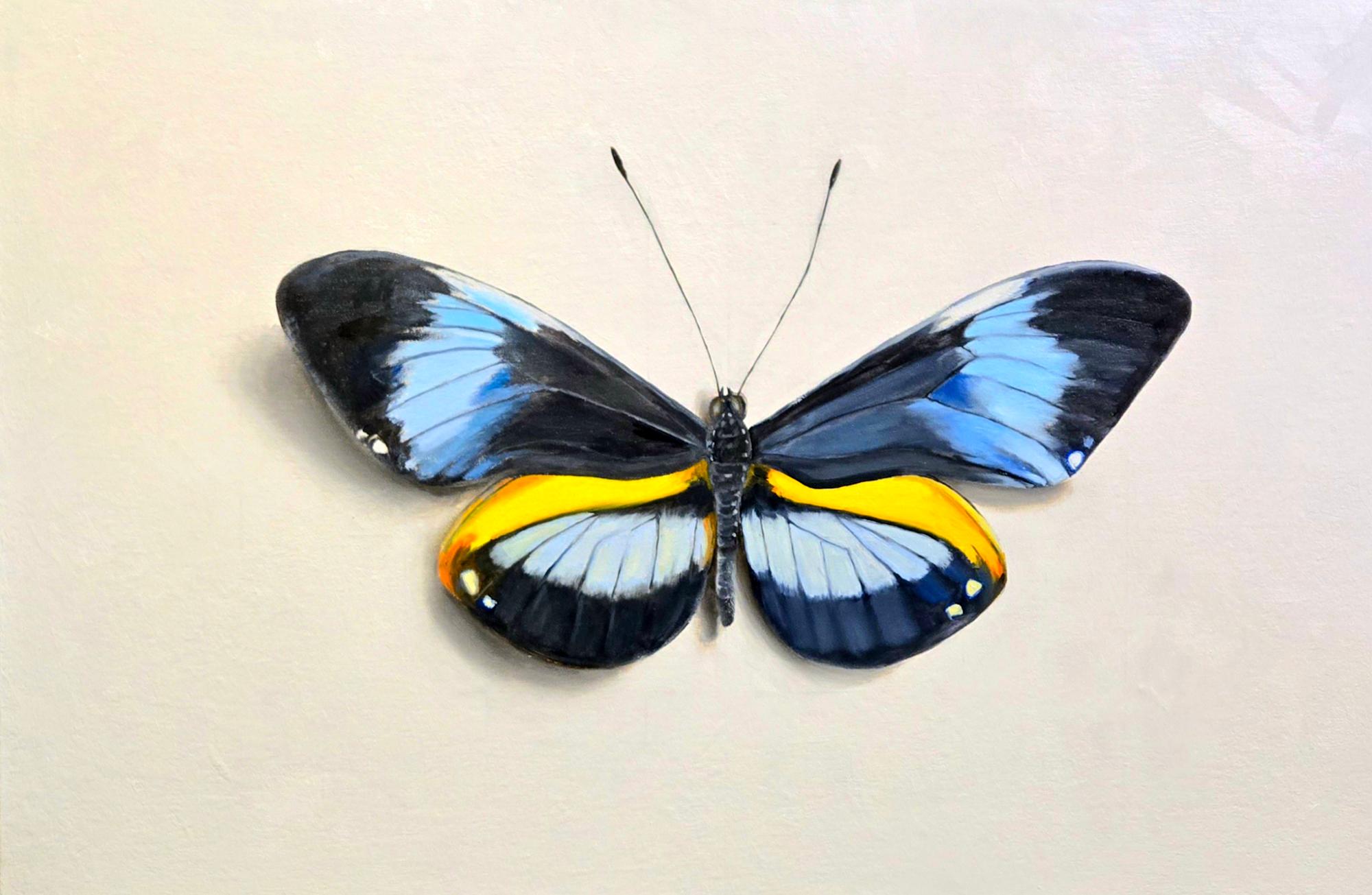 Blue Longwing, oil on canvas mounted to gallery wood panel, 24 x 36 inches