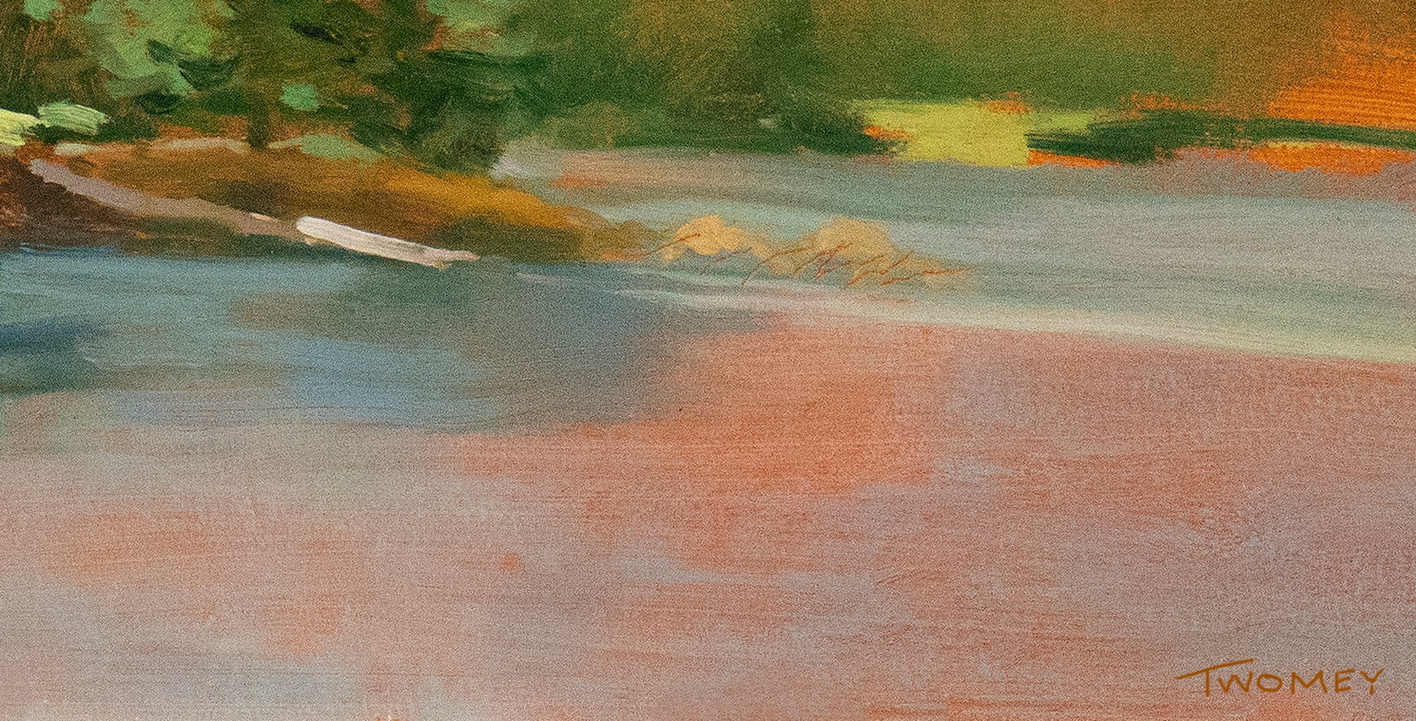 The weather is so incredibly variable in the mountains, and this day was no exception. I made my way around this lake, Bass Lake, in Blowing Rock, NC - Blue Ridge mountains. Surrounded by threatening cumulus clouds, I quickly set up and immediately planned out the composition. Suddenly, sunlight flooded the island in the lake's middle, and I knew I had my painting. The flashes of light green and blue highlighted the dark pines against the mountainside. The light fell on a downed log, prompting a highlight that finished the piece. As dozens of people made their way past and around the lake path, it felt like we were all in it together - a race against the lightning in an electric moment.