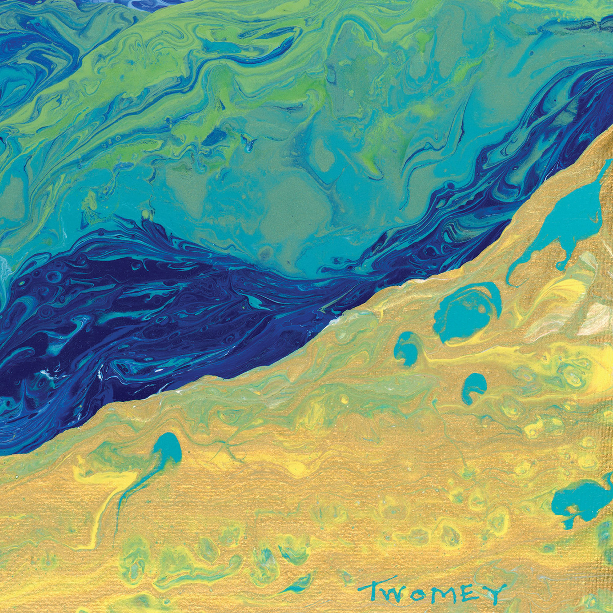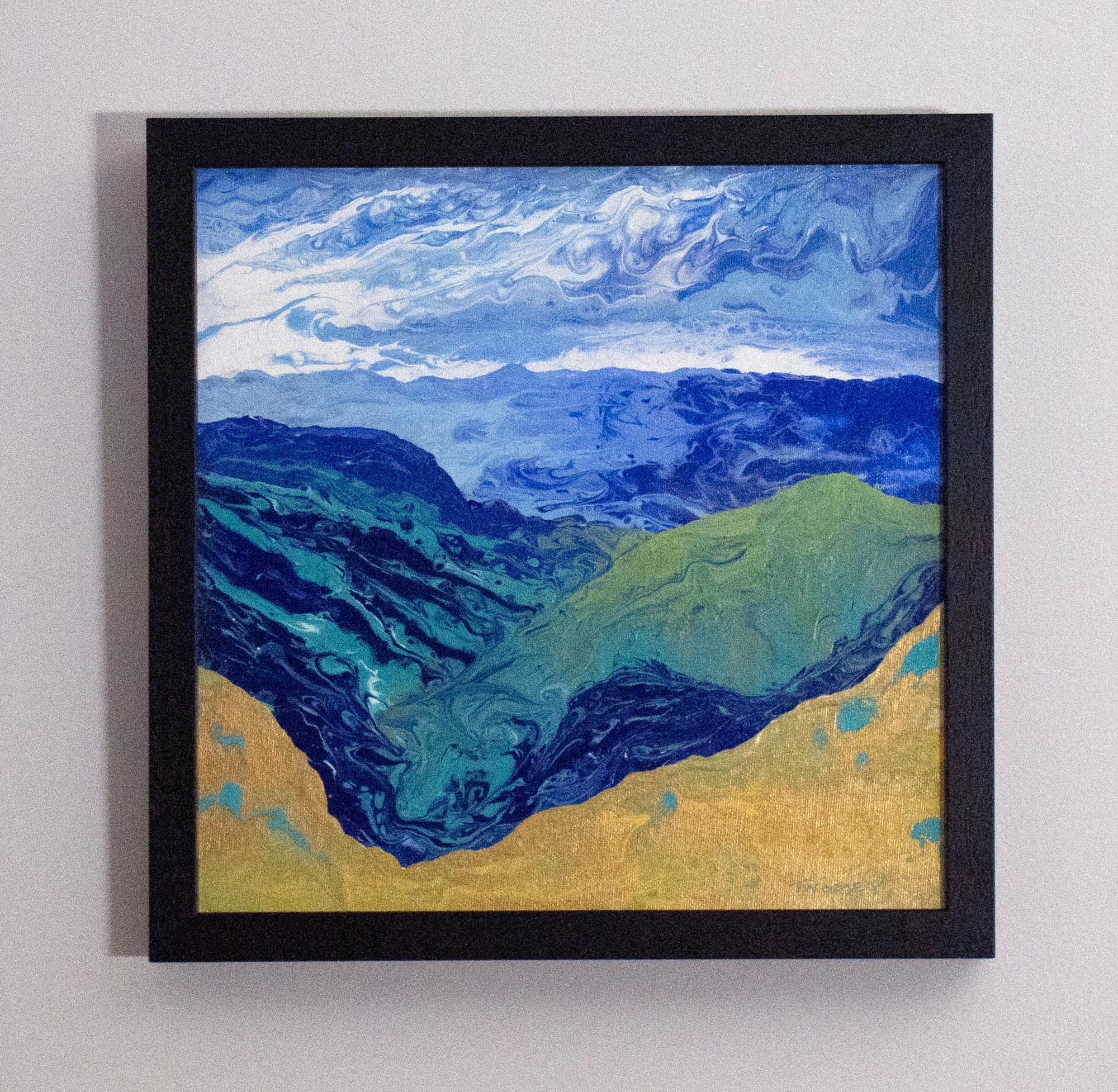Observe the patterns of distant mountains to frontals; be equally impressed by the way clouds cast their shadows on a sunny day. The fluid paint echoes the fluidity of the weather; the shifting patterns of the cloud shapes on the mountains and the swirling cloud tufts. Imagine the freshness of the air and how alive you can feel in the mountain breezes as you gaze on the world moving below you.