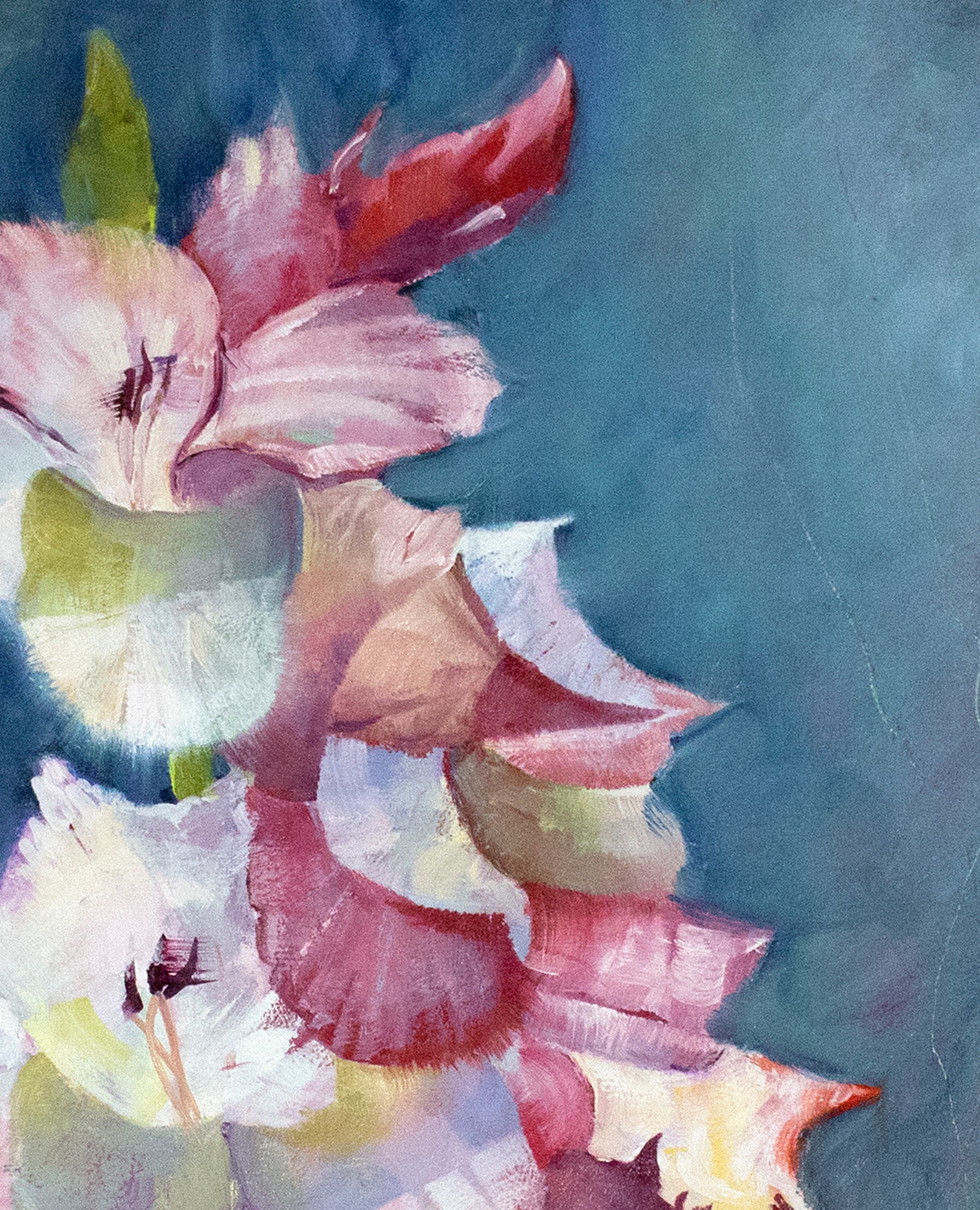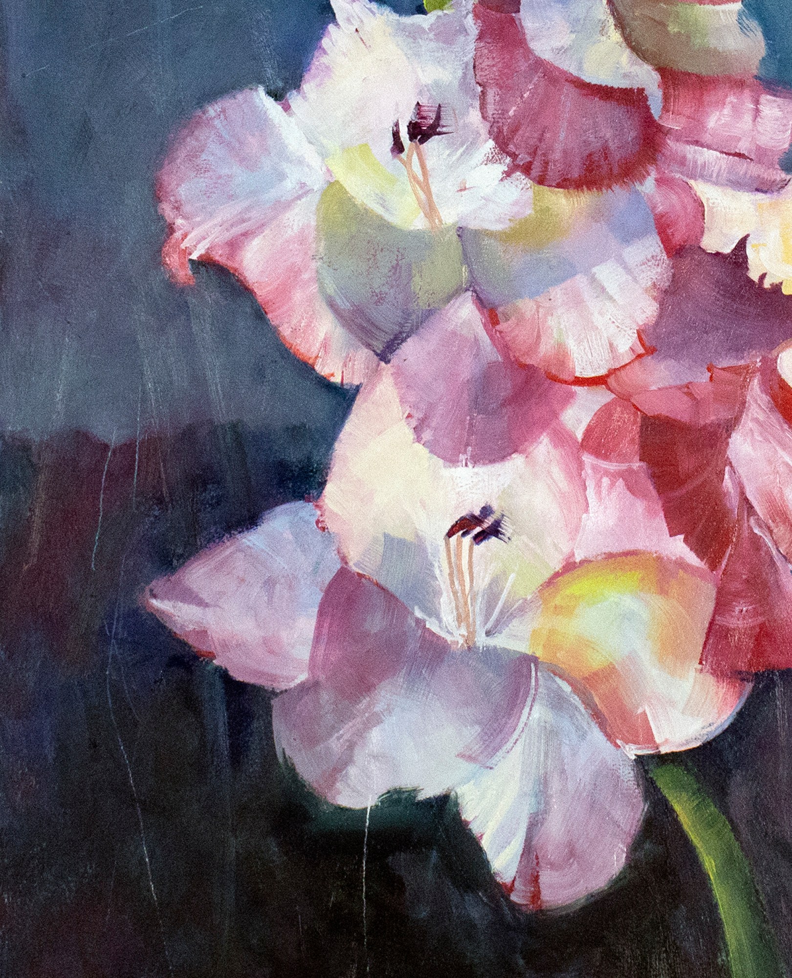 There is very little that makes me more proud than growing a beautiful, pink etc. gladiolus from a bulb. Not only that - I've discovered they can even spread themselves! What I particularly loved about this one was the light from behind it. I have attempted to make a painting before that glows - but finally, this one actually does! The rich contrasts of alizarin crimson against veridian and sap green, coupled to the whites - well, they sing! This original oil is painted on an archival linen board and is unframed. If you revel in the beauty of nature - well, here you go.